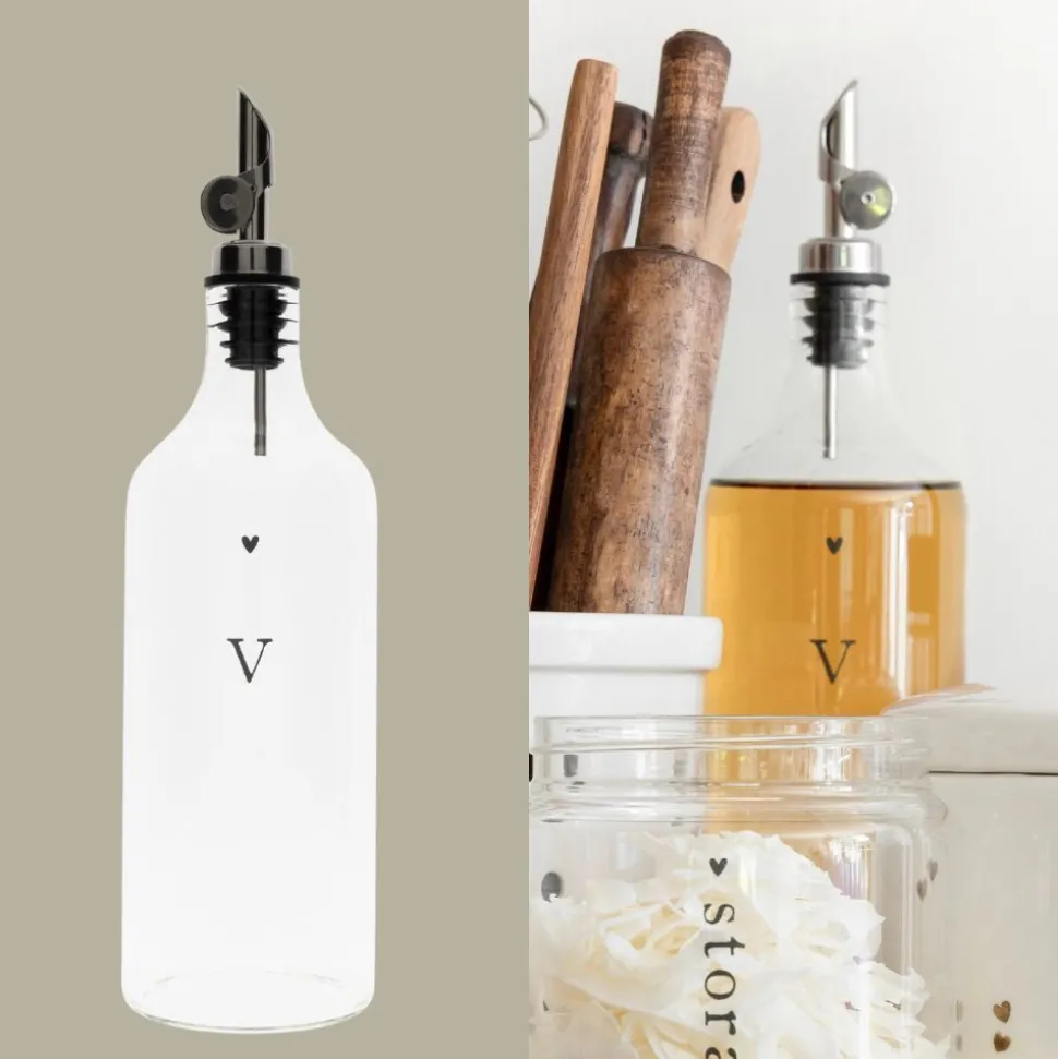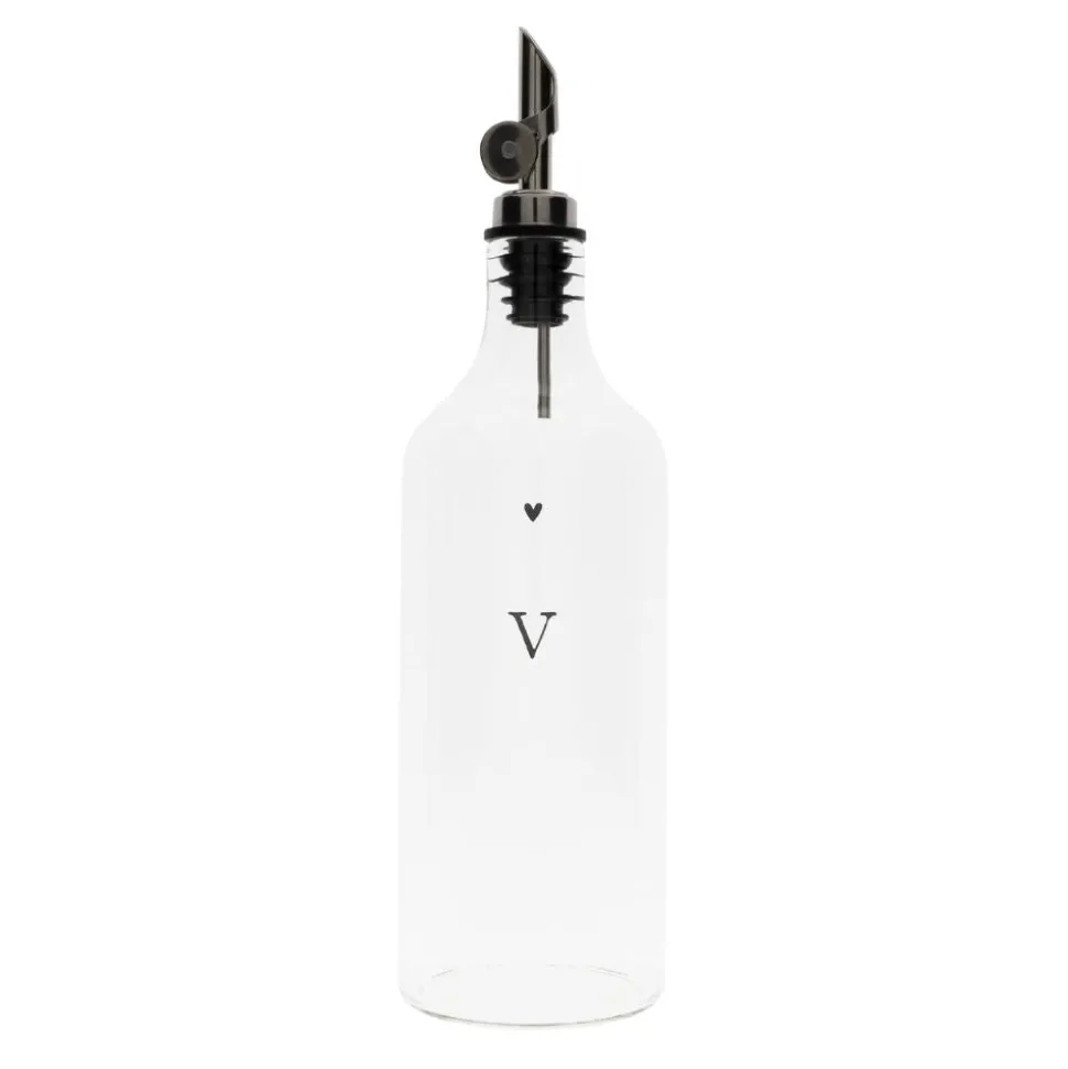 Diese stilvolle Essigflasche aus transparentem Glas von Bastion Collections verbindet praktischen Nutzen mit einem klaren, modernen Design. Mit einer Höhe von 29 Zentimetern und einem Durchmesser von 8 Zentimetern ist sie nicht nur handlich, sondern auch ein eleganter Blickfang auf deiner Küchenzeile oder dem Esstisch.Auf der Vorderseite steht ein großes, schlichtes V, ein Hinweis auf den Inhalt der Flasche. Direkt darüber befindet sich ein kleines schwarzes Herz, welches eine persönliche, charmante Note verleiht. Diese liebevolle Gestaltung macht die Flasche zu mehr als nur einem Gebrauchsgegenstand.Die integrierte Gießvorrichtung ermöglicht dir ein gezieltes und tropffreies Dosieren – ideal beim Verfeinern von Salaten, Marinaden oder Gemüsegerichten. Der praktische Verschluss sorgt dafür, dass der Essig sein volles Aroma behält und vor unnötigem Luftkontakt geschützt ist.Ob beim täglichen Kochen oder bei einem gemütlichen Abendessen mit Gästen, diese Flasche ist ein funktionaler und zugleich dekorativer Helfer, der Stil und Ordnung in deine Küche bringt.Sie eignet sich auch wunderbar als Geschenk für alle, die Freude an gutem Geschmack und liebevollen Details haben. Eine Essigflasche, die zeigt, dass auch in der Küche kleine Dinge große Wirkung haben können.