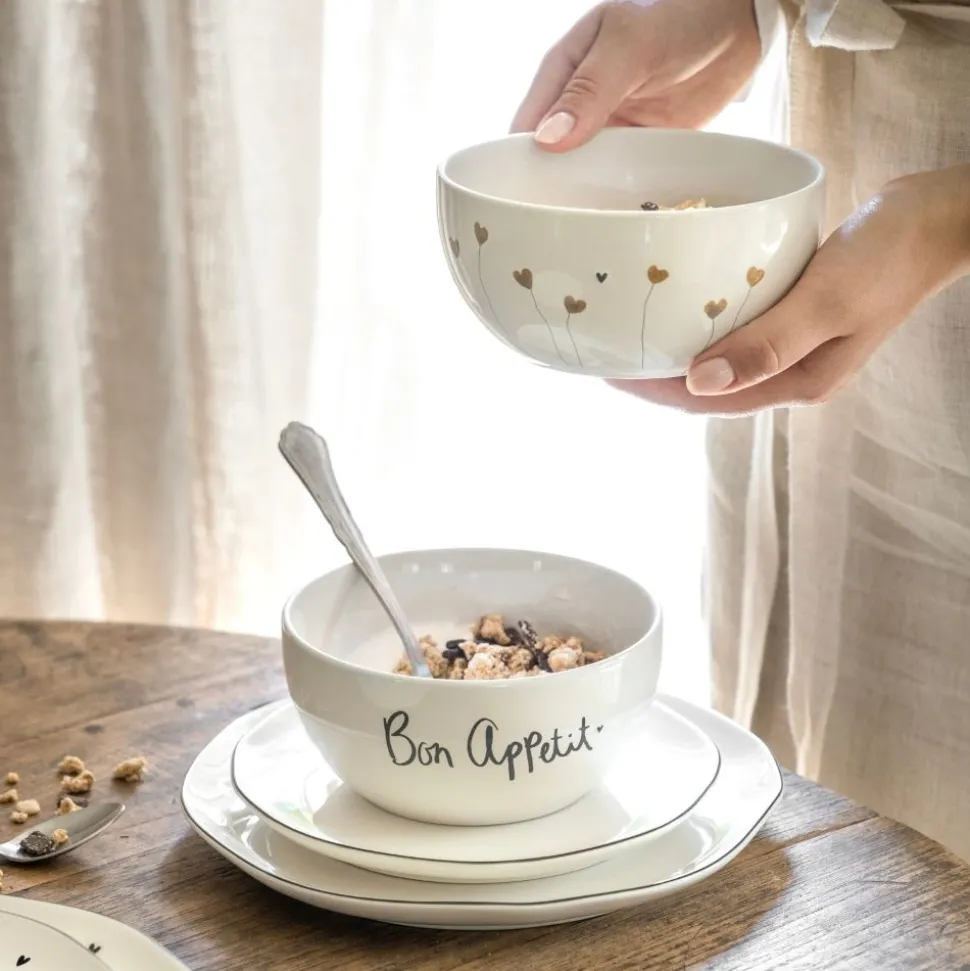 Diese wunderschöne Schale aus weißer Keramik ist ein echter Blickfang auf deinem Tisch – schlicht im Design, aber mit liebevollen Details, die sofort ins Auge fallen.Der besondere Hingucker ist der schnörkelige Schriftzug Bon Appetit, der elegant auf der Außenseite platziert ist. Direkt daneben sitzt ein kleines Herz in edlem Schwarz, das dem Ganzen eine warme, stilvolle Note verleiht – typisch Bastion Collections. Die feinen Linien und die verspielte Schriftzug machen diese Schüssel zu etwas ganz Besonderem, ohne aufdringlich zu wirken.Mit ihrer praktischen Größe eignet sie sich perfekt für dein Frühstücksmüsli, Joghurt mit Obst, kleine Salate oder Snacks zwischendurch. Sie liegt angenehm in der Hand und macht jeden Bissen ein bisschen schöner.Und wenn du den Look liebst, wirst du dich freuen: Passende Becher im ähnlichen Design machen das Set komplett. So kannst du dein Geschirr ganz nach deinem Geschmack kombinieren und für ein harmonisches Gesamtbild auf deinem Tisch sorgen.Ob für dich selbst oder als liebevolles Geschenk – diese Schüssel bringt schlichte Eleganz und eine Extraportion Herz in deinen Alltag. Ein echtes Lieblingsstück, das mit kleinen Details große Wirkung zeigt.