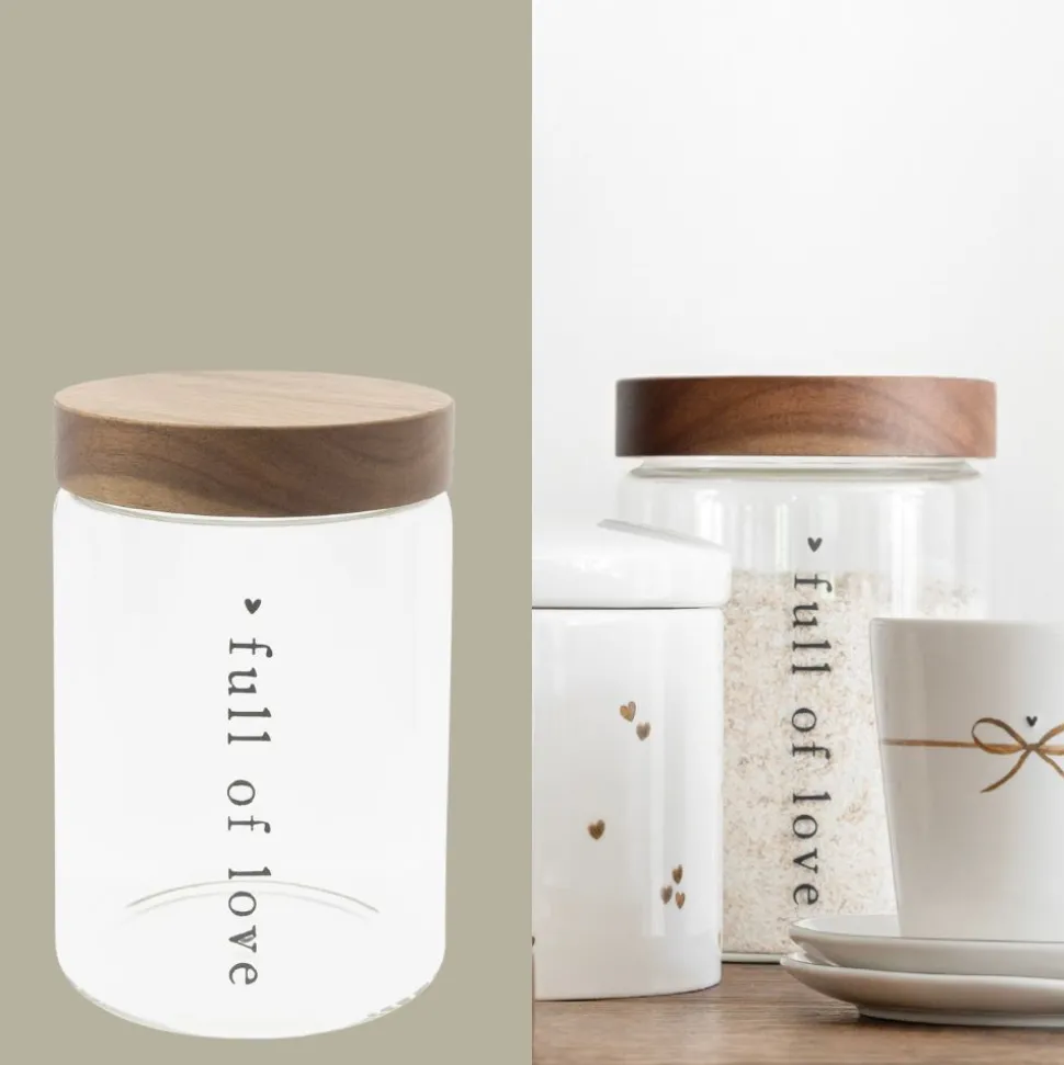 Dieses Vorratsglas aus klarem Glas mit einem hochwertigen Holzdeckel von Bastion Collections verbindet praktischen Nutzen mit liebevollem Design. Mit einer Höhe von 18 Zentimetern und einem Durchmesser von 12 Zentimetern bietet es viel Platz, um deine Lieblingszutaten wie Mehl, Zucker, Nudeln oder andere Vorräte stilvoll aufzubewahren.Auf der Vorderseite ist der Schriftzug full of love senkrecht angeordnet, darüber liegt ein kleines schwarzes Herz, das dem Glas eine warme und persönliche Note verleiht. Dieses liebevolle Detail macht das Glas zu einem besonderen Hingucker in deiner Küche oder Speisekammer.Der Holzdeckel sorgt für einen festen Verschluss und bringt gleichzeitig einen natürlichen, warmen Akzent ins Design. So bleiben deine Vorräte frisch und gut geschützt, während das Glas zugleich dekorativ wirkt.Ob für den eigenen Gebrauch oder als Geschenk – dieses Vorratsglas bringt Stil, Ordnung und eine Portion Herzlichkeit in deinen Alltag.