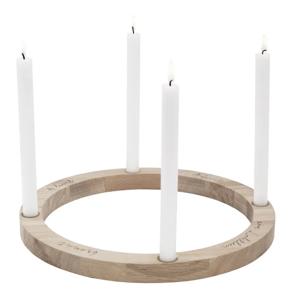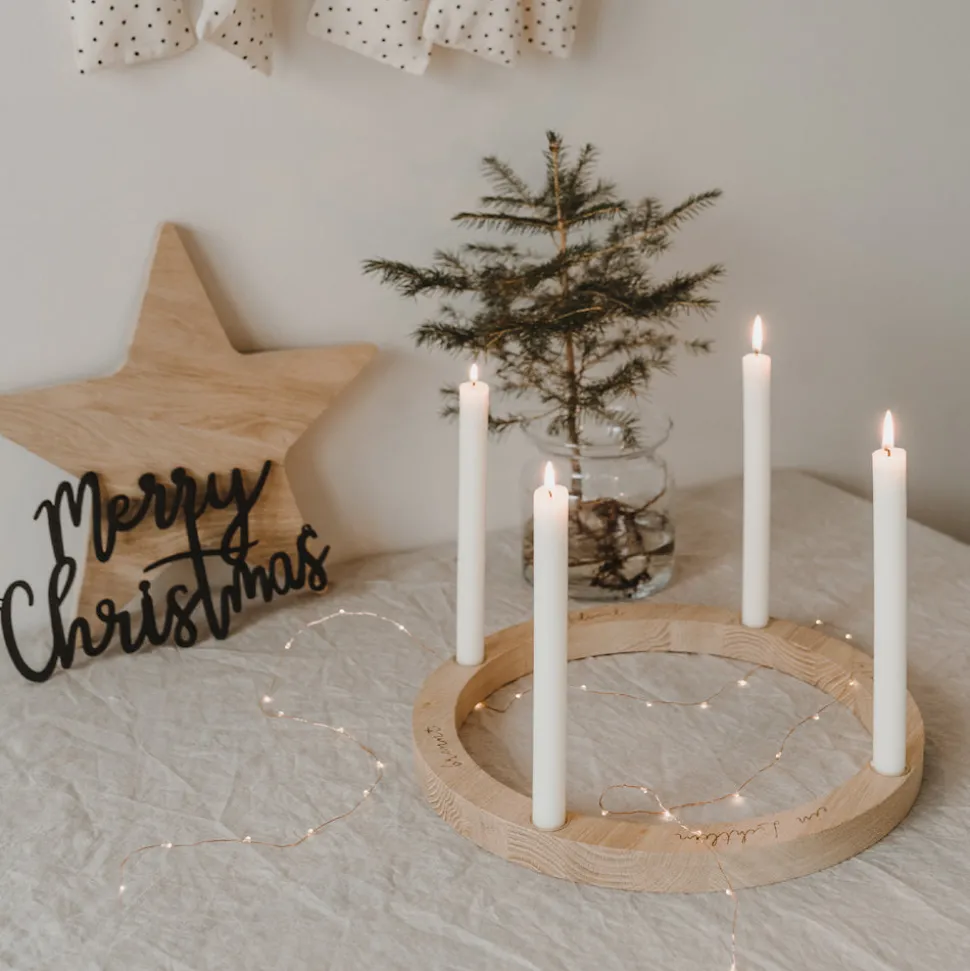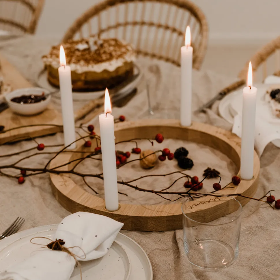 Der Eulenschnitt Adventskranz Eiche ist in der ganzen Adventszeit für Dich da und möchte Dir die dunklen Stunden erhellen. In den goldfarbenen Tüllen ist traditionell Platz für vier Kerzen, die einen Durchmesser von 2,2 cm haben sollten. Der Eulenschnitt Adventskranz misst in der Höhe 4 cm und im Durchmesser 36 cm, das macht ihn sehr stabil, aber Kerzen solltest Du dennoch niemals unbeaufsichtigt lassen.