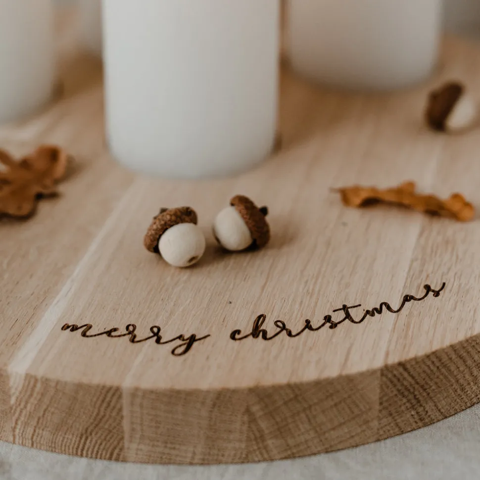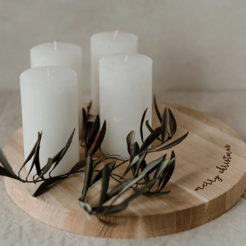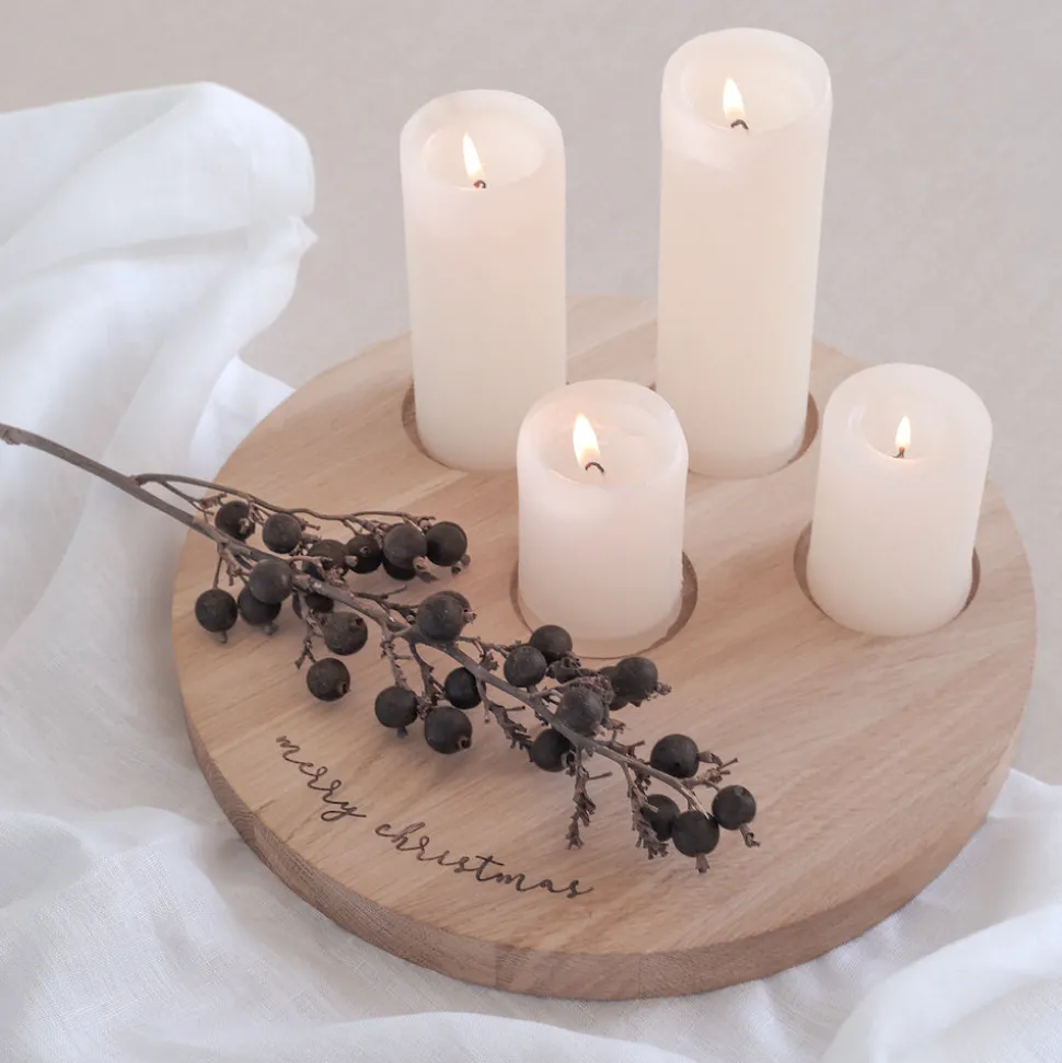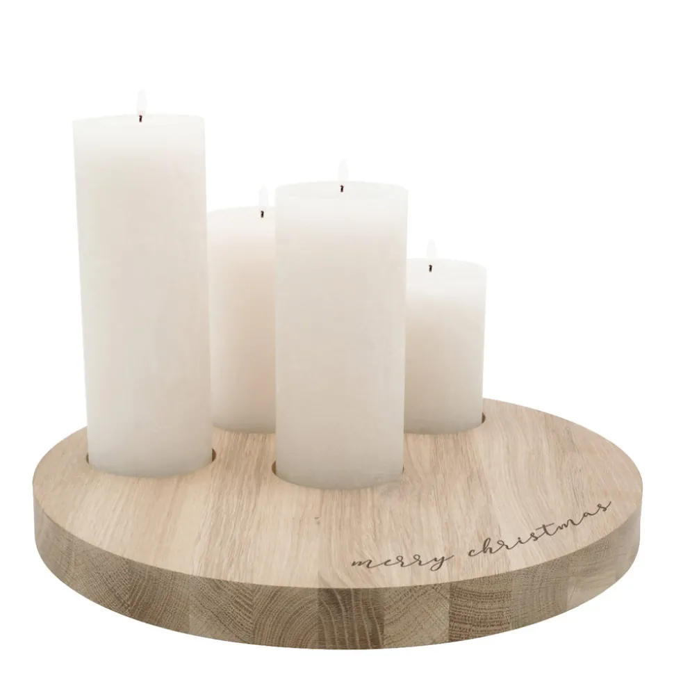Mit dem Eulenschnitt Kerzenbrett Merry Christmas hast Du nicht nur Platz für vier schöne Kerzen mit einem Durchmesser von 6,9 cm, sondern auf dem Brett ist noch Platz für eine Kleinigkeit zum Dekorieren. So kannst Du auf den typischen Kranz verzichten und den Advent ganz nach Deinen Vorstellungen gestalten. Das Kerzenbrett von Eulenschnitt hat einen Durchmesser von 32 cm, eine Höhe von 3 cm und besteht aus Eichenholz.