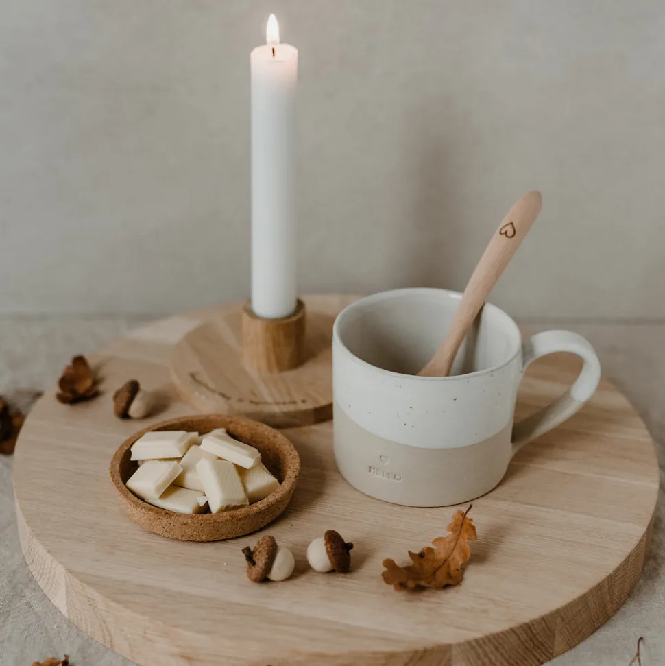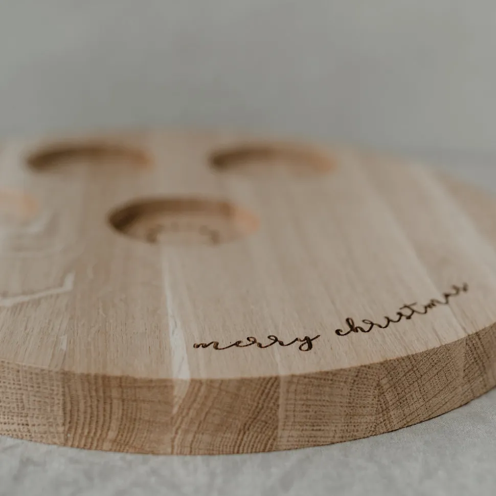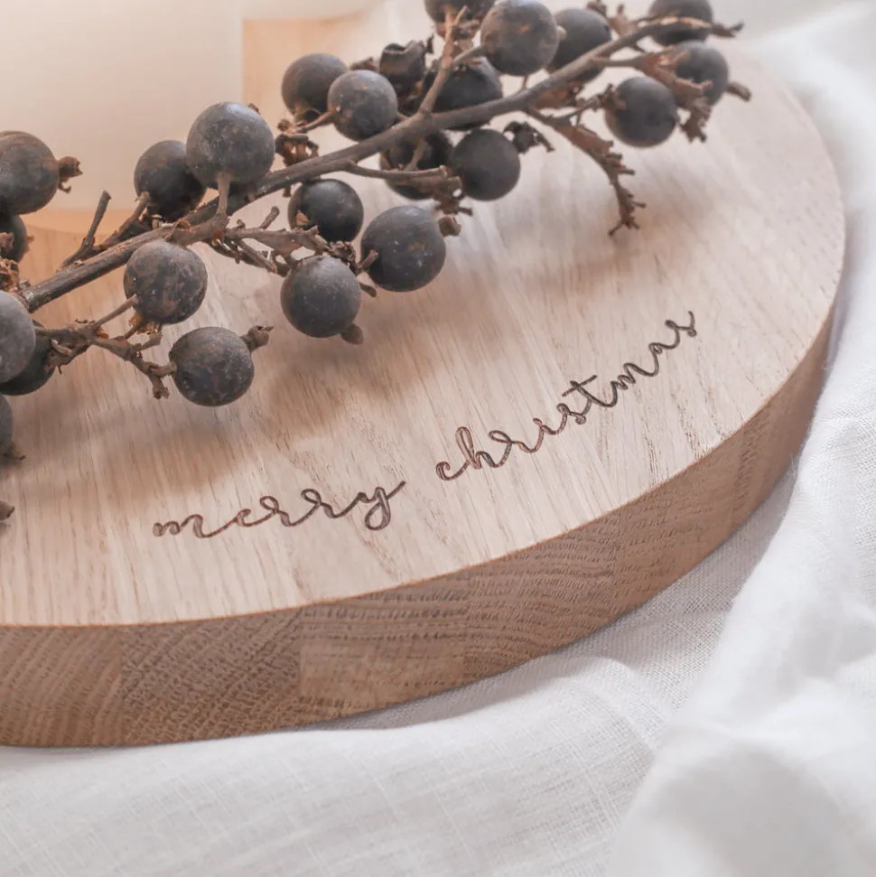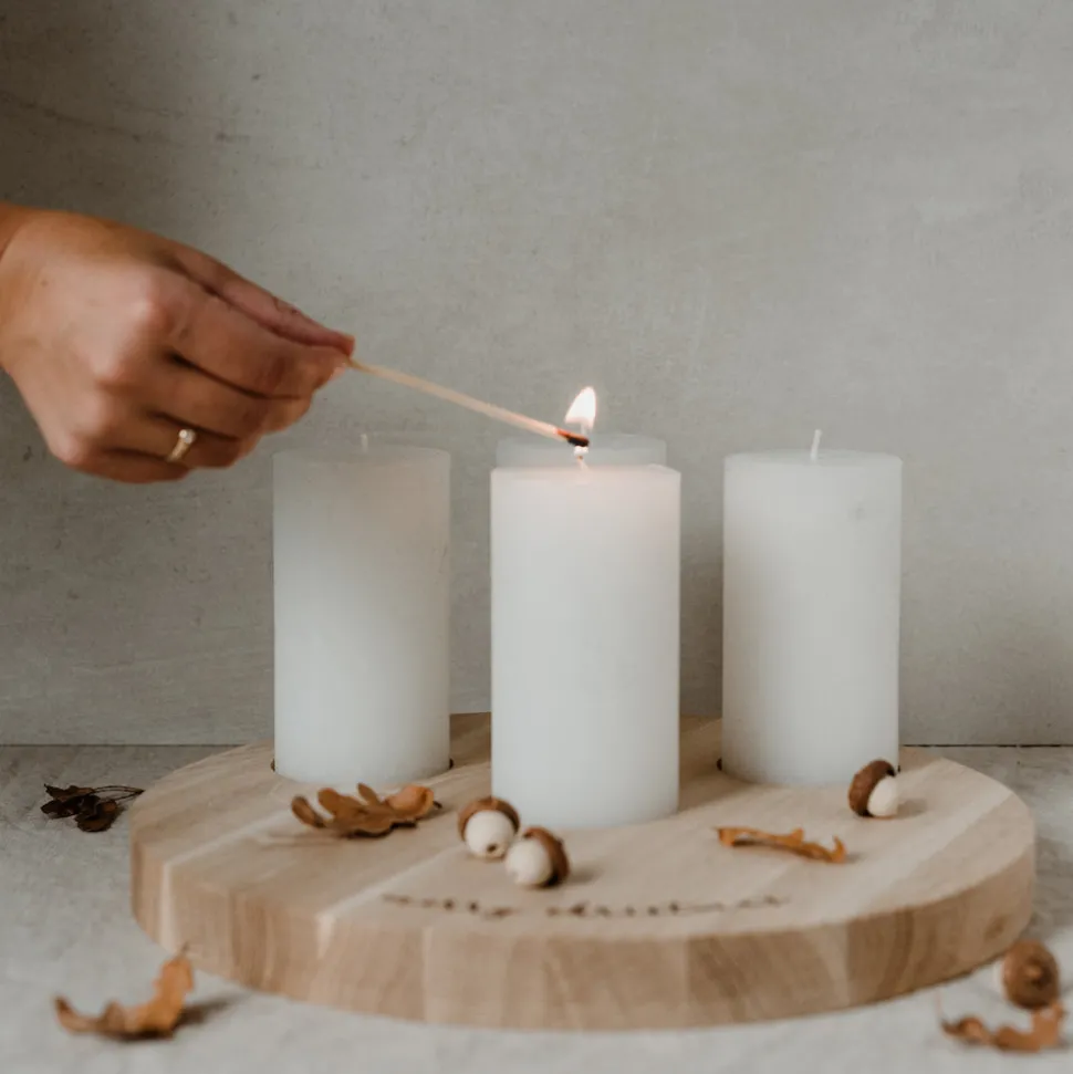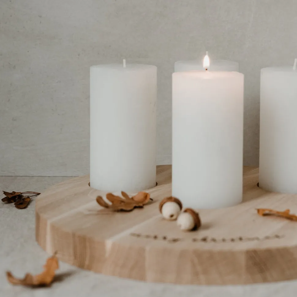 Mit dem Eulenschnitt Kerzenbrett Merry Christmas hast Du nicht nur Platz für vier schöne Kerzen mit einem Durchmesser von 6,9 cm, sondern auf dem Brett ist noch Platz für eine Kleinigkeit zum Dekorieren. So kannst Du auf den typischen Kranz verzichten und den Advent ganz nach Deinen Vorstellungen gestalten. Das Kerzenbrett von Eulenschnitt hat einen Durchmesser von 32 cm, eine Höhe von 3 cm und besteht aus Eichenholz.