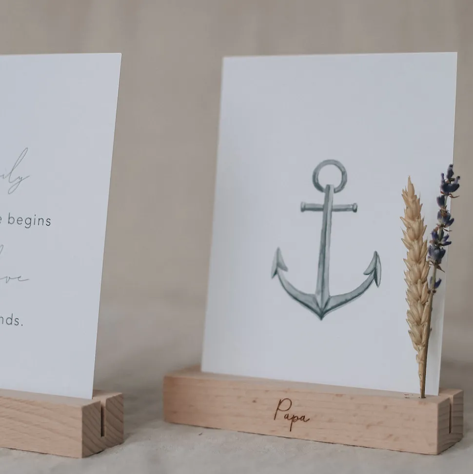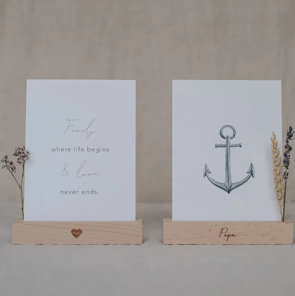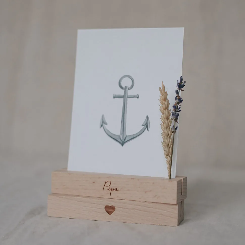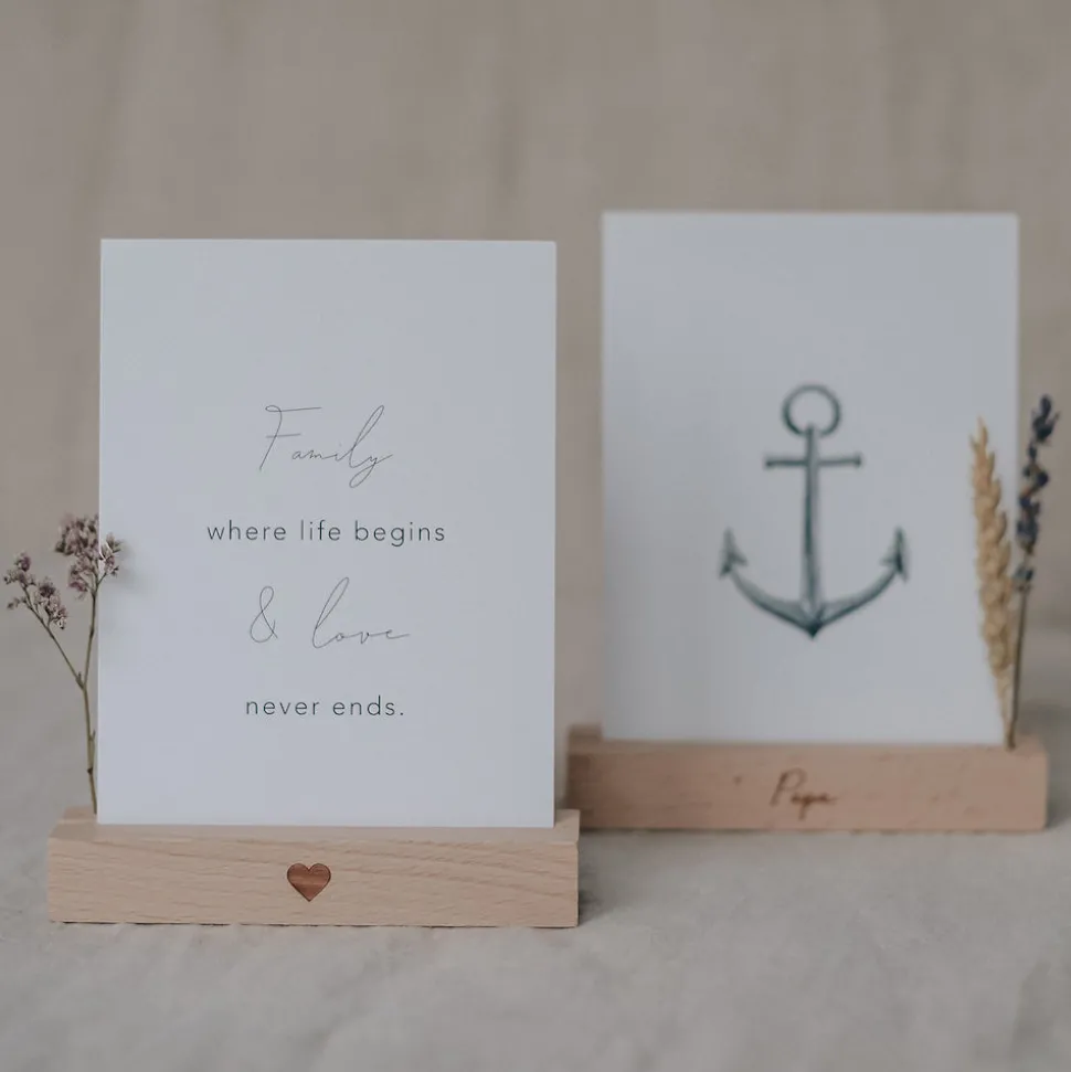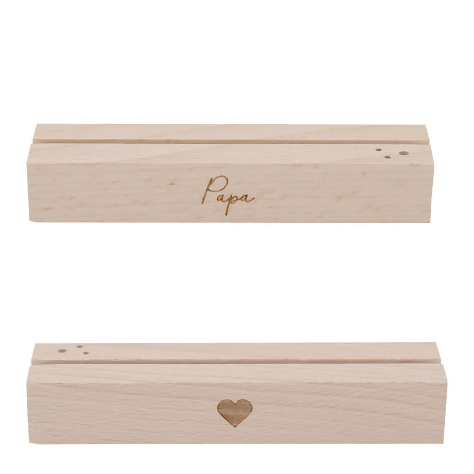 Dieses Kartenständer-Set von Eulenschnitt lässt Papa-Herzen höher schlagen. Bestücke die beiden Ständer mit einem Foto oder einer Grußkarte und einem Trockenblümchen. So kannst Du Deinem Papa eine ganz besondere Freude machen. Auf dem einen Kartenständer findest Du den Schriftzug Papa und auf dem anderen ein kleines Herzchen. In drei kleinen Löchern finden die Trockenblumen ihren Platz. Mit einer Länge von 12 cm eignet sich dieses tolle Karten- und Trockenblumenständer Papa 2er-Set sehr gut für Karten und Fotos im Format DIN A6. Ein wundervolles Geschenk von Eulenschnitt zum Vatertag oder einfach zwischendurch.