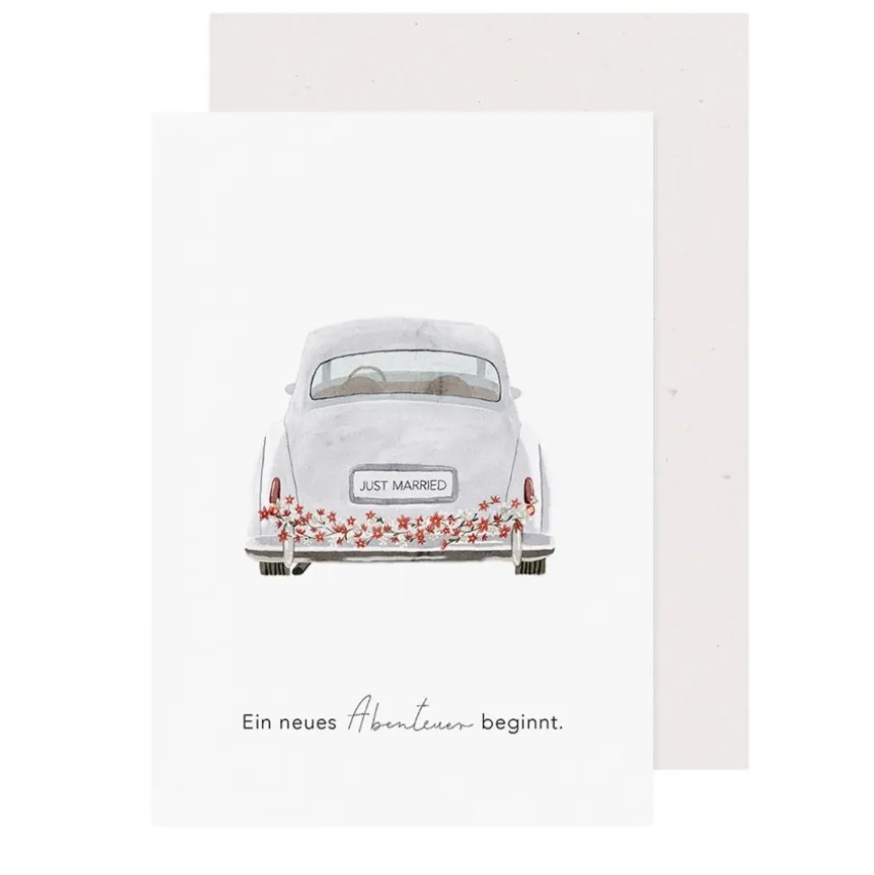 Die Klappkarte Hochzeitsauto von Eulenschnitt ist eine liebevoll gestaltete Karte zur Hochzeit, die mit ihrem charmanten Motiv und einer klaren Botschaft begeistert. Auf der Vorderseite ist ein wegfahrendes Hochzeitsauto zu sehen, detailreich illustriert mit kleinen Blechdosen am Heck und festlicher Blumendeko. Auf dem Kennzeichen steht in verspielter Handschrift Just Married – ein Symbol für den Beginn eines neuen Lebensabschnitts.Direkt unter dem Motiv findest du den Spruch Ein neues Abenteuer beginnt, der die Karte zu einer ganz besonderen Botschaft macht. Er erinnert daran, dass die Ehe nicht nur ein Versprechen ist, sondern auch der Auftakt zu vielen gemeinsamen Momenten, Entscheidungen und Erinnerungen.Das Motiv ist auf einem schlichten weißen Hintergrund platziert, wodurch die Illustration besonders gut zur Geltung kommt. Die Karte strahlt Leichtigkeit, Freude und Wärme aus – perfekt für moderne Hochzeiten mit persönlicher Note.Die Innenseite der Karte ist unbedruckt und bietet dir viel Platz für eigene Worte, Glückwünsche oder kleine Geschichten. Gedruckt auf hochwertigem, mattem Papier liegt die Karte angenehm in der Hand und lässt sich wunderbar beschreiben.Ein passender Umschlag ist im Lieferumfang enthalten, sodass du sie sofort verschenken oder verschicken kannst.Die Klappkarte Hochzeitsauto ist ein Produkt von Eulenschnitt und steht wie immer für liebevolles Design, feine Details und hochwertige Materialien. Eine wundervolle Wahl für alle, die zur Hochzeit mehr als nur ein paar Worte verschenken möchten.