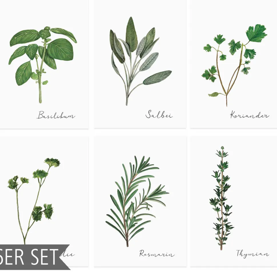 Ohne Kräuter wäre das Leben nur halb so schön! Dann hol dir das Kräuterkarten 6er- Set von Eulenschnitt. Die Karten sind mit sechs unterschiedlichen Aquarellen von Kräutern bedruckt, die aus der Küche nicht wegzudenken sind. Nicht nur Gartenliebhaber und Küchenprofis werden von diesen Postkarten begeistert sein. Als originelle Glückwunschkarte zum Geburtstag oder einfach nur so per Post versendet – die Kräuterkarten passen immer! Du kannst sie auch in den Kartenständern von Eulenschnitt auf deiner Anrichte präsentieren – da werden deine Gäste Augen machen! (Die Kartenständer erhälst du übrigens auch bei uns im Shop)