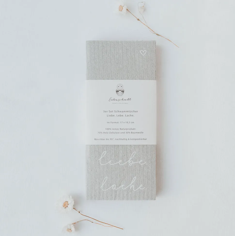 Eulenschnitt Schwammtücher Lebe – Liebe – Lache 3er-Set grau