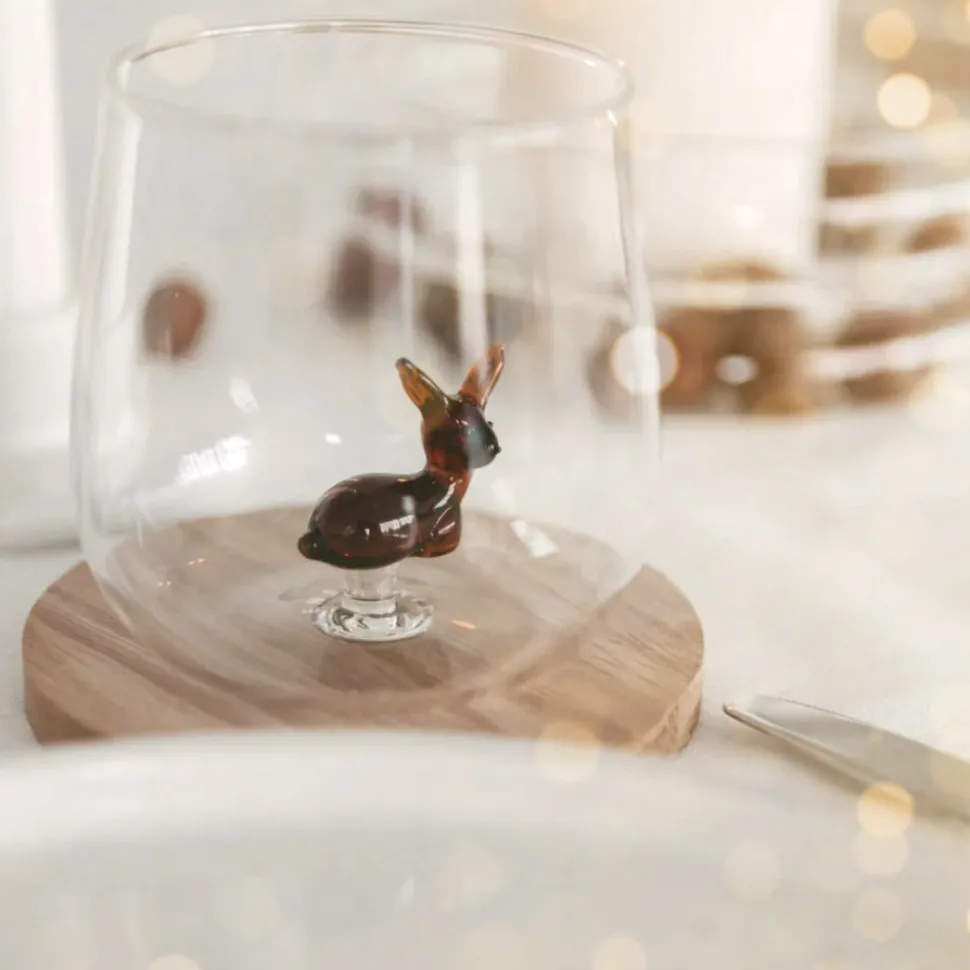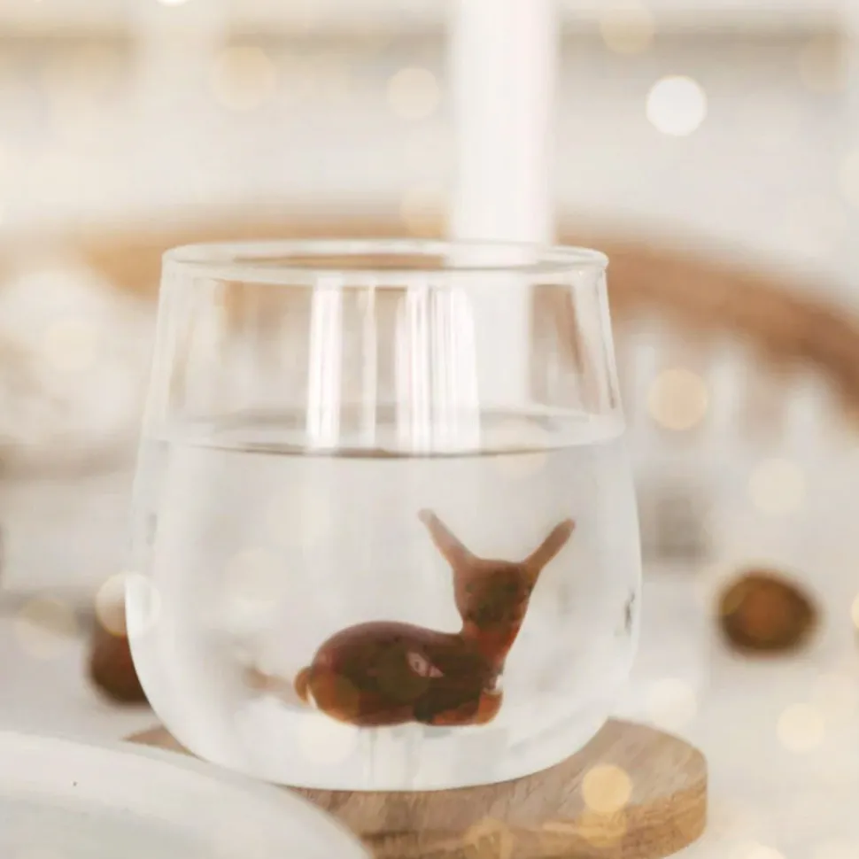 Du hältst ein besonderes Trinkglas von Eulenschnitt in der Hand, klar und schlicht im Design, doch im Inneren verbirgt sich eine kleine Überraschung. Am Boden des Glases sitzt eine detailreiche Rehfigur in warmem Braunton, fest im Glas verankert und sichtbar von allen Seiten. Die Figur wirkt fast lebendig, als würde sie still im Morgentau eines Waldes stehen. Durch den 3D‑Effekt scheint das Reh je nach Blickwinkel zu schweben oder auf dem Grund deines Getränks zu ruhen.Du gießt Wasser, Saft oder dein Lieblingsgetränk ein und beobachtest, wie sich die Rehfigur in der Flüssigkeit spiegelt. Sie verleiht dem Moment etwas Magisches, fast wie eine kleine Geschichte, die in deinem Glas lebt. Du spürst sofort die liebevolle Gestaltung, das feine Geweih, die sanfte Haltung, die ruhige Ausstrahlung. Dieses Glas ist kein Zufallsfund, es ist bewusst gewählt, für dich, der du Freude an besonderen Details hast.Es liegt angenehm in der Hand, ist stabil, hochwertig verarbeitet und natürlich für den täglichen Gebrauch gemacht. Robust, aber trotzdem voller Charme und Charakter. Ob am Frühstückstisch, beim gemütlichen Tee oder abends mit Freunden – dieses Glas bringt Wärme und Naturverbundenheit in deinen Alltag.Es erinnert dich daran, dass auch kleine Dinge einen Zauber tragen können. Mit jedem Schluck nimmst du ein Stück Waldidylle mit dir, ganz still und ganz für dich.