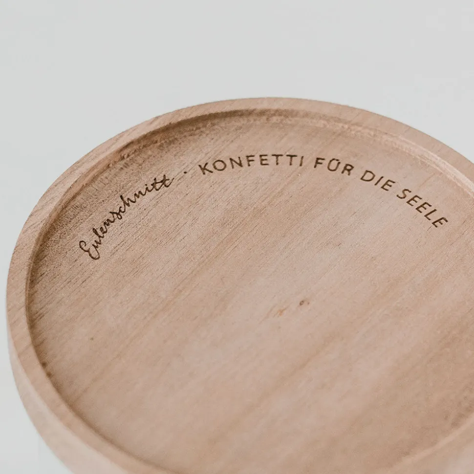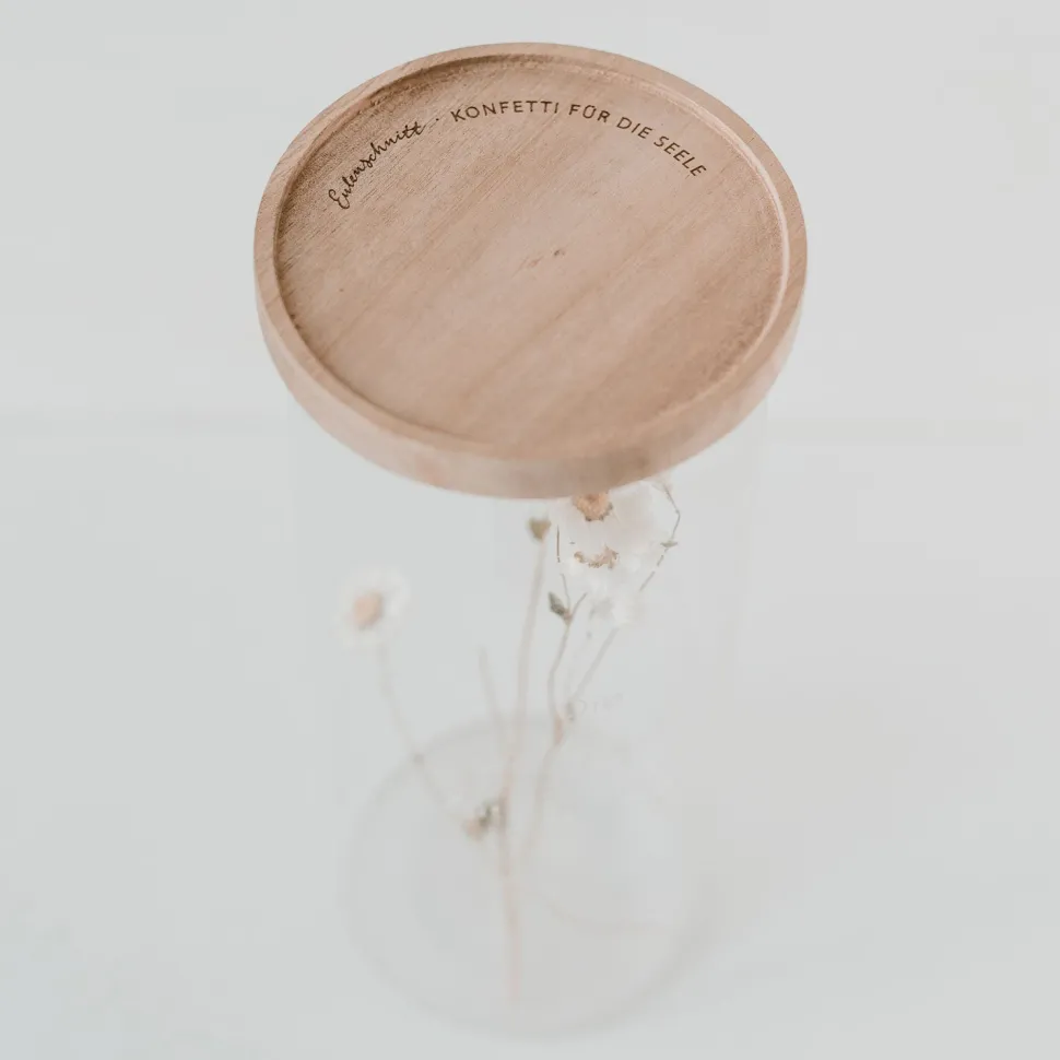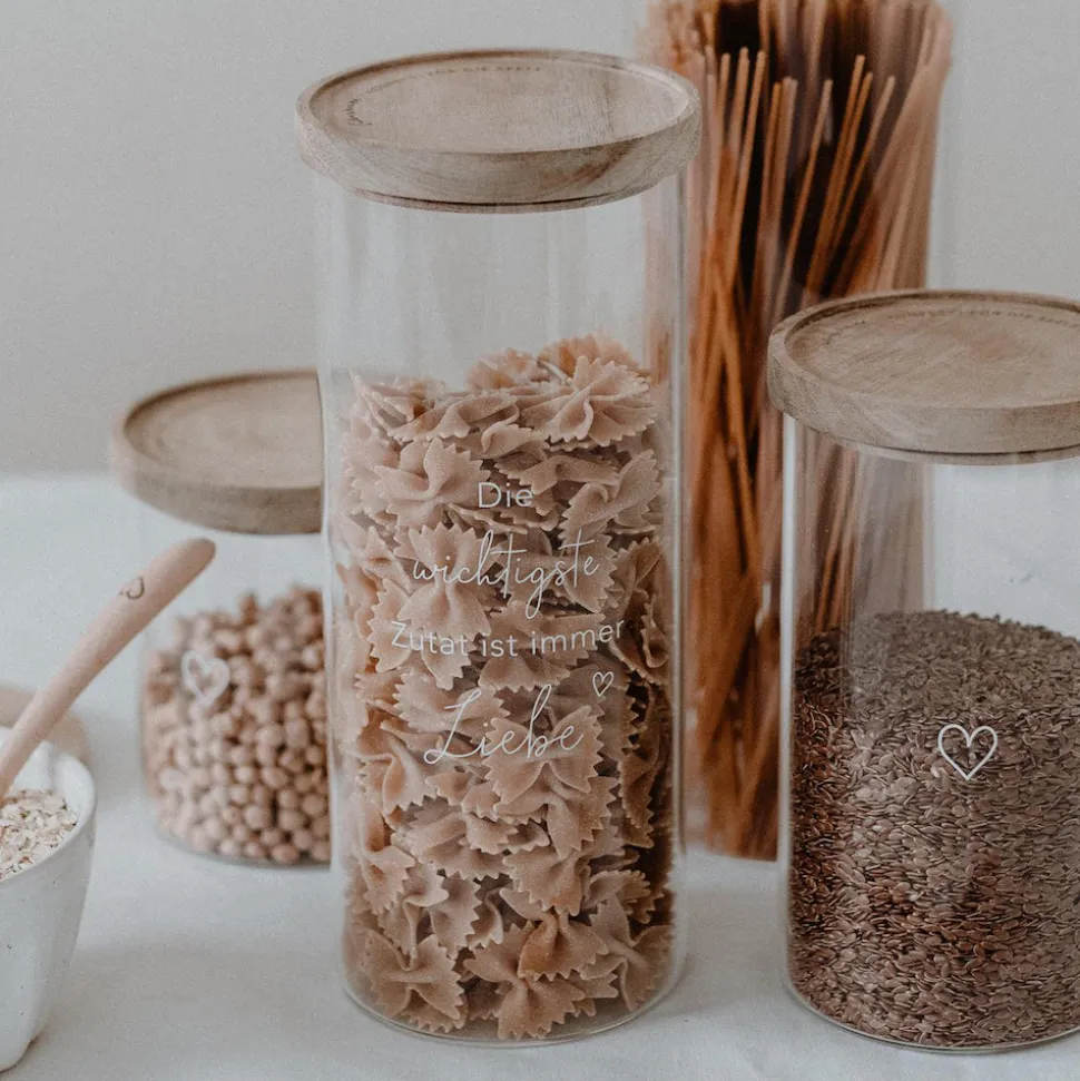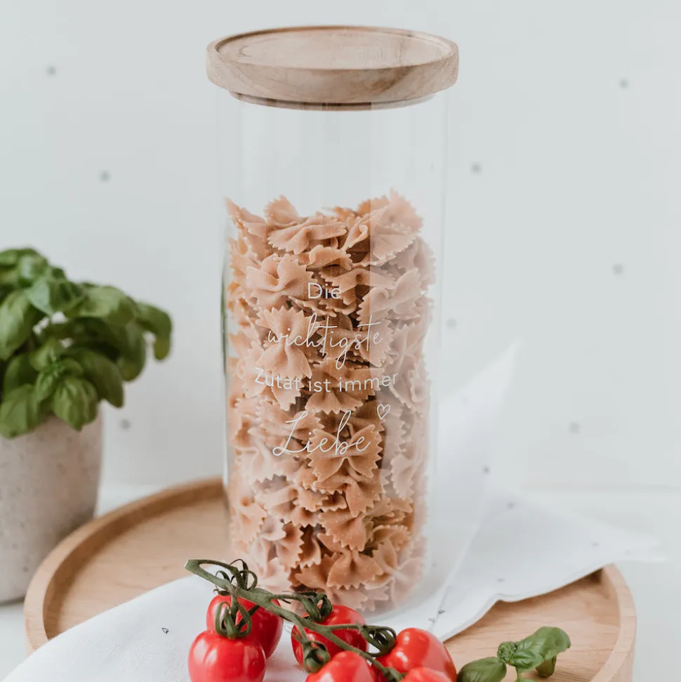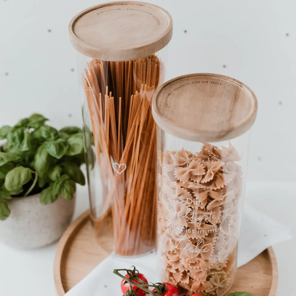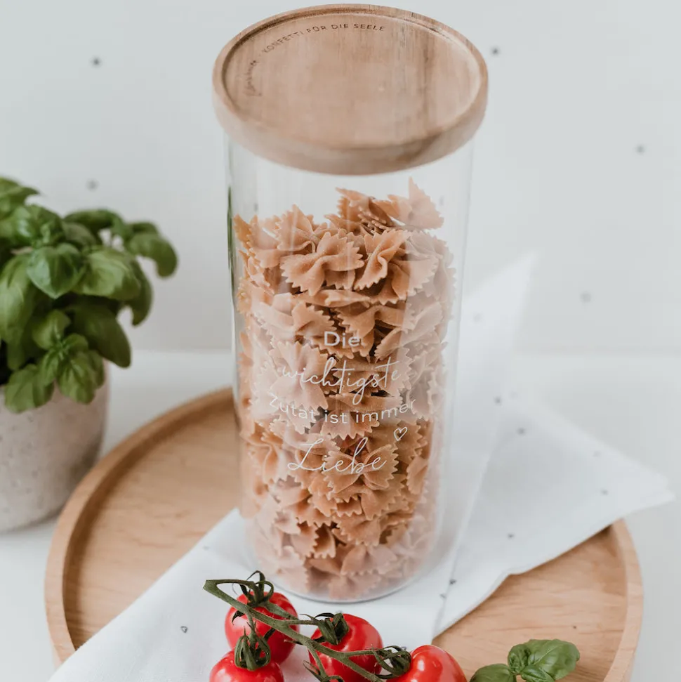 Die wichtigste Zutat ist immer Liebe. Mit diesem Vorratsglas kannst Du Deine Zutaten richtig in Szene setzen. Das Glas besteht aus hochwertigem Borosilikatglas und wird mit einem Deckel aus Akazienholz verschlossen. Jeder Deckel ist ein Unikat und einzigartig in seiner Struktur. Besonders schön ist das gelaserte Motto ‚Konfetti für die Seele‘ auf dem Deckel.Das Glas hat eine Höhe von 25 cm und ein Fassungsvermögen von 1850 ml. Entdecke weitere tolle Eulenschnittprodukte für Deinen Haushalt in unserem Shop.