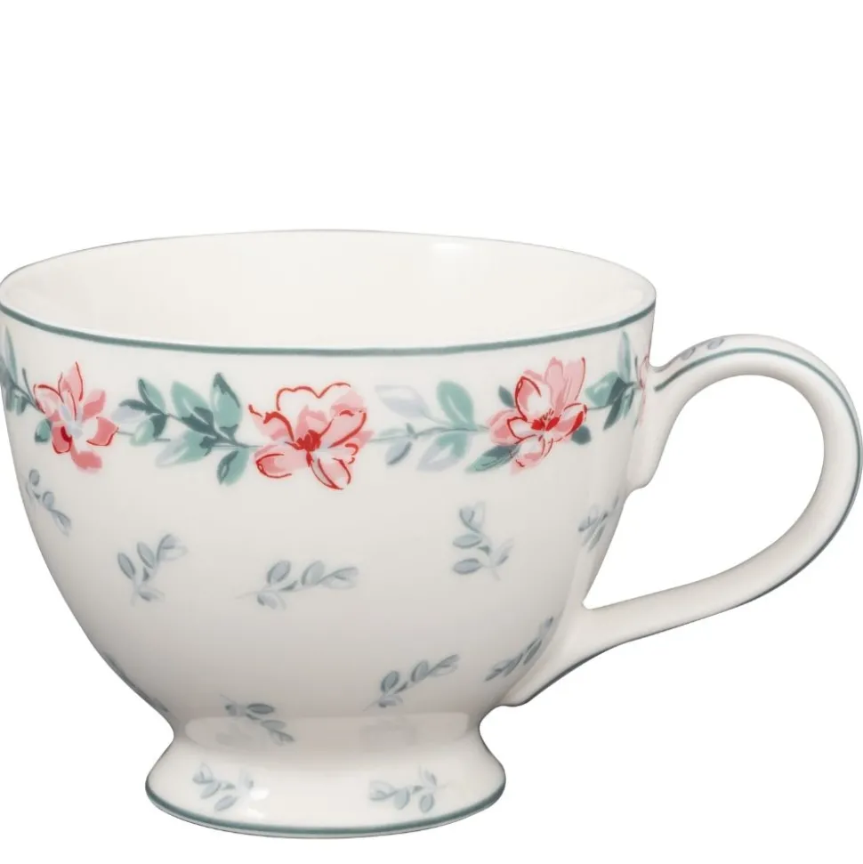 Die Teetasse Jalia von Greengate verzaubert durch ihr strahlend weißes Porzellan, das kunstvoll von einem zarten Kranz aus rosafarbenen Blumen und türkisem Blattwerk umschlossen wird. Das fein verzweigte Blattwerk ergänzt das florale Design perfekt und schafft eine harmonische Verbindung von Farbe und Form, die dem Gesamtbild eine frische und natürliche Eleganz verleiht. Die Kombination aus sanften Rosatönen und kühlem Türkis sorgt für eine lebendige, zugleich beruhigende Wirkung, die Deine Teestunden auf besondere Weise bereichert.