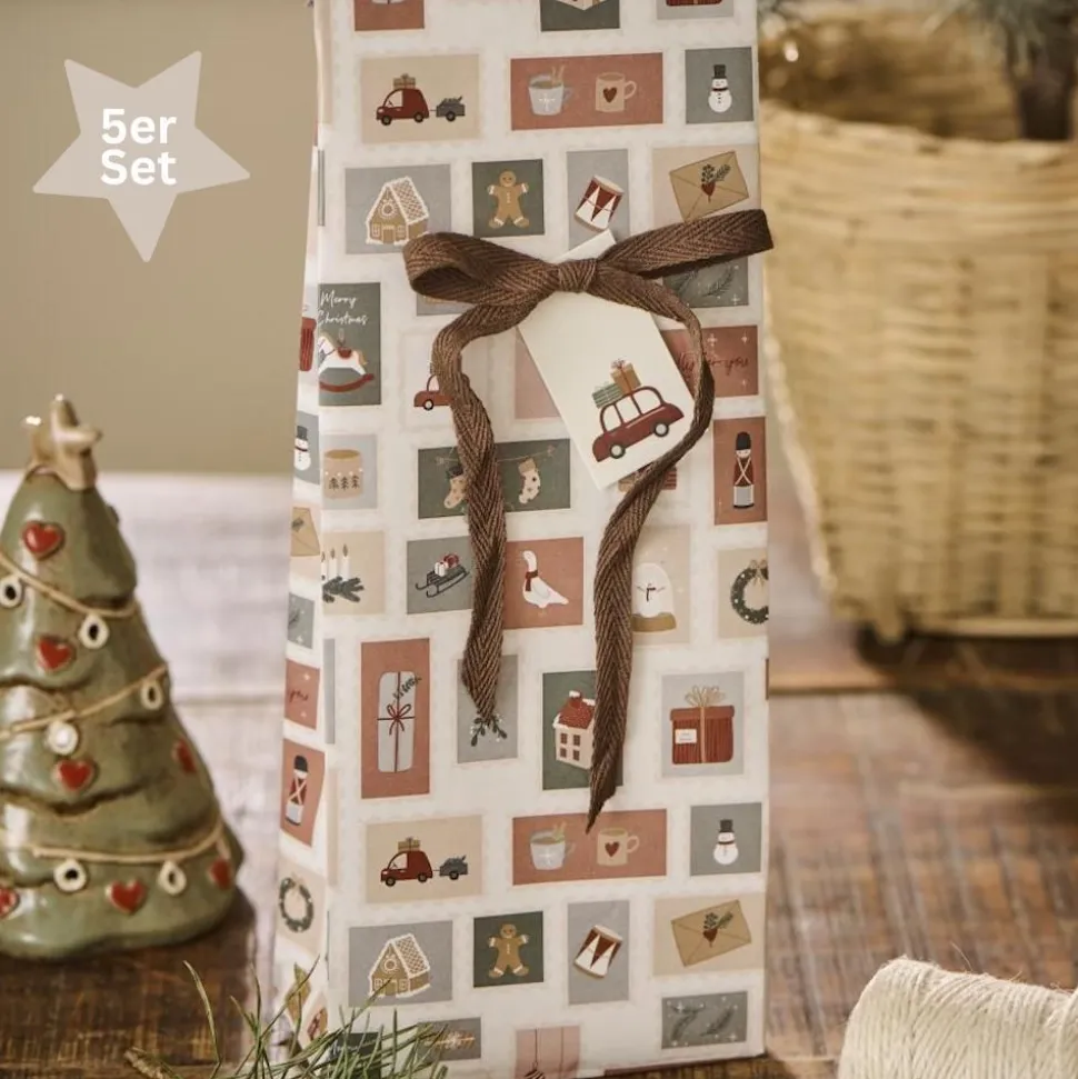 Die langen Buntfalttüten von Ib Laursen sind mit liebevoll gestalteten Weihnachtsbriefmarken verziert, die Deinem Geschenk eine festliche und nostalgische Atmosphäre verleihen. Die Tüten eignen sich perfekt als Verpackung von Flaschen und Gläsern. Das 5er-Set Tüten ist aus robustem Papier gefertigt, das sowohl umweltfreundlich als auch wiederverwendbar ist.