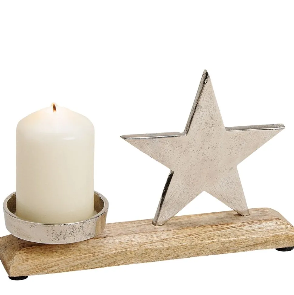 Dieser elegante Kerzenhalter in Silberfarben zieht mit seinem hübschen silberfarbenen Stern alle Blicke auf sich. Der Kerzenhalter steht auf einem natürlichen Holzsockel, der dem Gesamtbild eine warme, rustikale Note verleiht. Die Kombination aus glänzendem Silberton und natürlichem Holz schafft einen schönen Kontrast, der perfekt zur festlichen Jahreszeit passt.