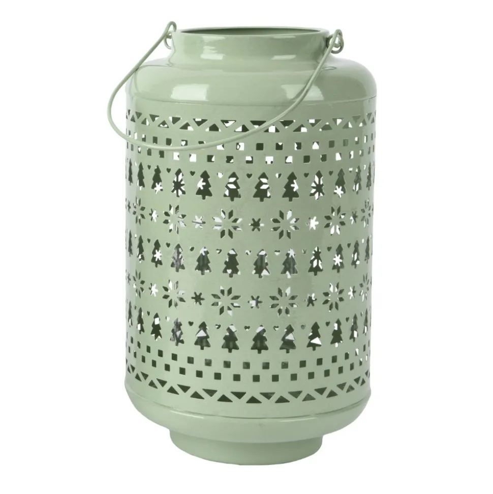 Zart, verspielt und voller Weihnachtszauber – mit dieser Laterne in sanftem Pastellgrün bringst Du stilvolle Winterromantik in Dein Zuhause. Die 27,5 cm hohe Eisenlaterne ist nicht nur ein dekoratives Highlight, sondern auch eine liebevolle Lichtquelle für gemütliche Stunden in der Adventszeit.Die ausgestanzten Weihnachtsmotive – kleine Sterne, Tannen oder Schneeflocken – machen die Laterne zu etwas ganz Besonderem. Sobald Du ein Teelicht oder eine LED-Kerze hineinstellst, werfen die feinen Formen zauberhafte Schatten an die Wand und hüllen Dein Zuhause in ein warmes, beruhigendes Licht.Das Pastellgrün bringt eine frische, freundliche Note in Deine Weihnachtsdeko – ideal, wenn Du es lieber hell und luftig magst, statt klassisch dunkel. Die Farbe lässt sich wunderbar mit Weiß, Silber, Naturmaterialien oder anderen Pastelltönen kombinieren. Ob im Wohnzimmer, auf der Fensterbank, dem Beistelltisch oder auf dem Balkon – die Laterne passt überall hin und sorgt für ein sanftes, festliches Ambiente.Du wirst sehen: Diese Laterne verzaubert nicht nur Dein Zuhause, sondern auch Deine Stimmung. Sie lädt Dich ein, innezuhalten, die Lichter zu genießen und die besondere Ruhe der Winterzeit zu spüren.Mach es Dir schön – mit Licht, Farbe und einem Hauch von Poesie. Diese Pastellgrüne Laterne ist wie ein leises Weihnachtslied: zart, stimmungsvoll und einfach herzerwärmend.