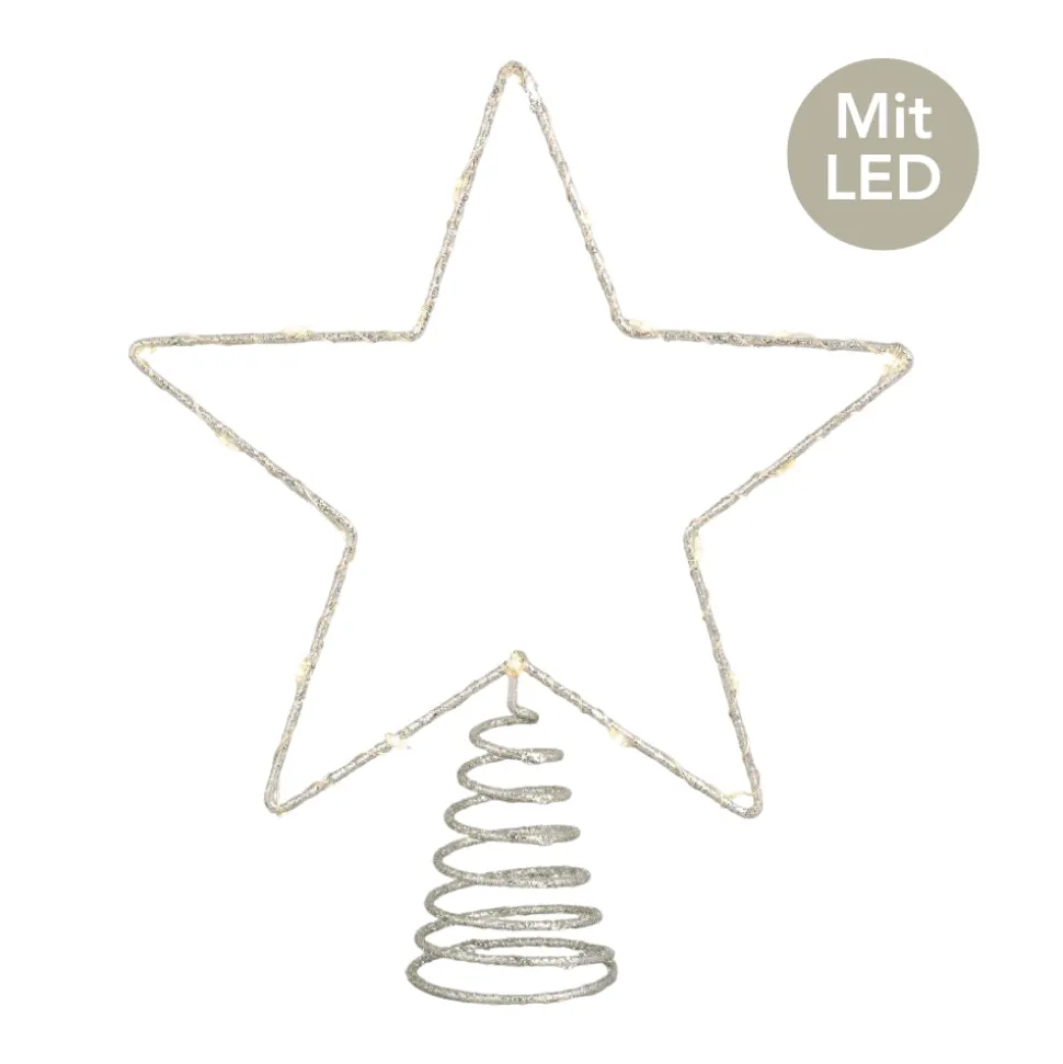 Ein festlich geschmückter Weihnachtsbaum wäre ohne seine Krönung nicht vollständig. Und was könnte ihn schöner abschließen als ein funkelnder Stern, der in warmem Licht erstrahlt? Diese silberfarbene Baumspitze mit integrierten LEDs ist die perfekte Ergänzung für Deinen Baum – ein wahrer Hingucker, der Eleganz und Gemütlichkeit vereint.Ausgestattet mit 20 warmweiß leuchtenden LEDs sorgt die Metallspitze für ein stimmungsvolles Licht, das unabhängig von Deiner restlichen Baumbeleuchtung funktioniert. Der Stern sitzt stabil auf einer dekorativen Spiralfeder, die sich ganz einfach auf der Tannenspitze befestigen lässt. Bei jedem Luftzug beginnt der Stern sanft zu wippen, was das Lichtspiel noch lebendiger und gemütlicher wirken lässt.Mit ihren Maßen von 27 cm in der Höhe und 22 cm in der Breite hat die Spitze genau die richtige Größe, um auf kleinen wie großen Bäumen gut zur Geltung zu kommen. Besonders praktisch: Dank des integrierten 6-Stunden-Timers schaltet sich der Stern täglich automatisch zur gewünschten Zeit ein und nach sechs Stunden wieder aus – ganz ohne Aufwand oder das tägliche Besteigen einer Leiter.Lass Deiner Fantasie freien Lauf und kreiere ein festliches Ambiente voller Glanz, Wärme und Magie. In unserem Onlineshop findest Du viele weitere inspirierende Ideen für Deinen Weihnachtsbaum und eine unvergessliche Adventszeit.
