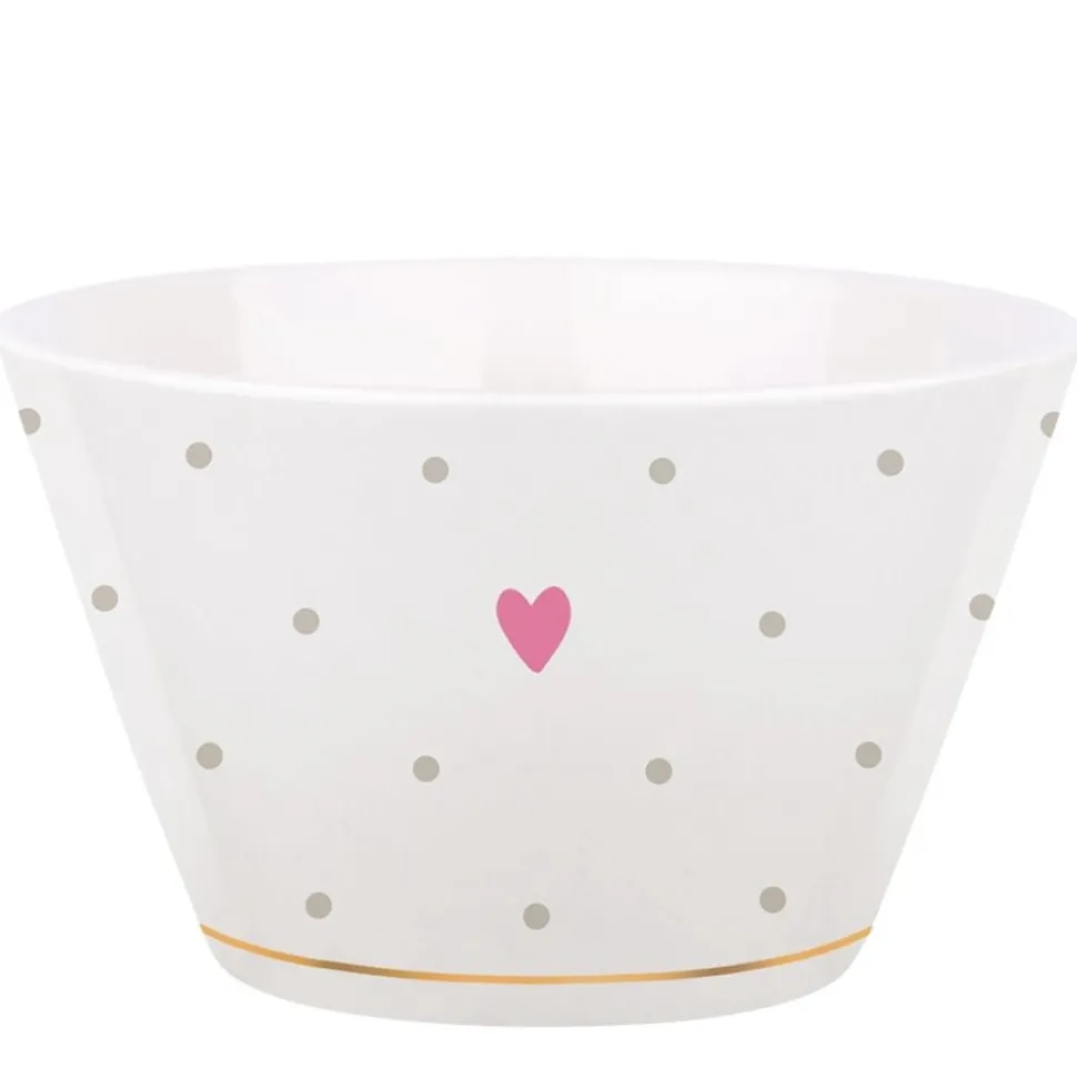 Diese zauberhafte Müslischale bringt eine harmonische Mischung aus Schlichtheit und liebevollen Details auf deinen Frühstückstisch. In klassischem Weiß gehalten, überzeugt sie durch ihr zartes Design und hochwertige Verarbeitung. Im Mittelpunkt steht ein rosa Herz auf der Vorderseite, schlicht, aber wirkungsvoll, als stilles Zeichen von Wärme und Zuneigung. Rund um die Schale sind kleine graue Punkte symmetrisch angeordnet, die dem Design eine sanfte Verspieltheit verleihen, ohne dabei aufdringlich zu wirken. Sie ergänzen das Herzmotiv perfekt und sorgen für ein ausgewogenes, modernes Gesamtbild. Ein besonderes Highlight ist die goldfarbene Linie am unteren äußeren Rand der Schale. Sie verleiht dem Gefäß einen eleganten Akzent und rundet das Design stilvoll ab. Der goldene Glanz fängt das Licht ein und lässt die Schale besonders hochwertig wirken. Diese Müslischale eignet sich ideal für Müsli, Porridge, Joghurt mit Früchten oder kleine Snacks – sowohl für den Alltag als auch für besondere Frühstücksmomente. Sie ist nicht nur funktional, sondern auch ein liebevoller Hingucker, der jeden Tisch verschönert. Ob für dich selbst oder als Geschenk für einen lieben Menschen – diese Schale verbindet Ästhetik mit Emotion und macht jede Mahlzeit ein kleines Stück besonderer. Ein Herzstück für die Küche, das mit kleinen Details große Wirkung zeigt.
