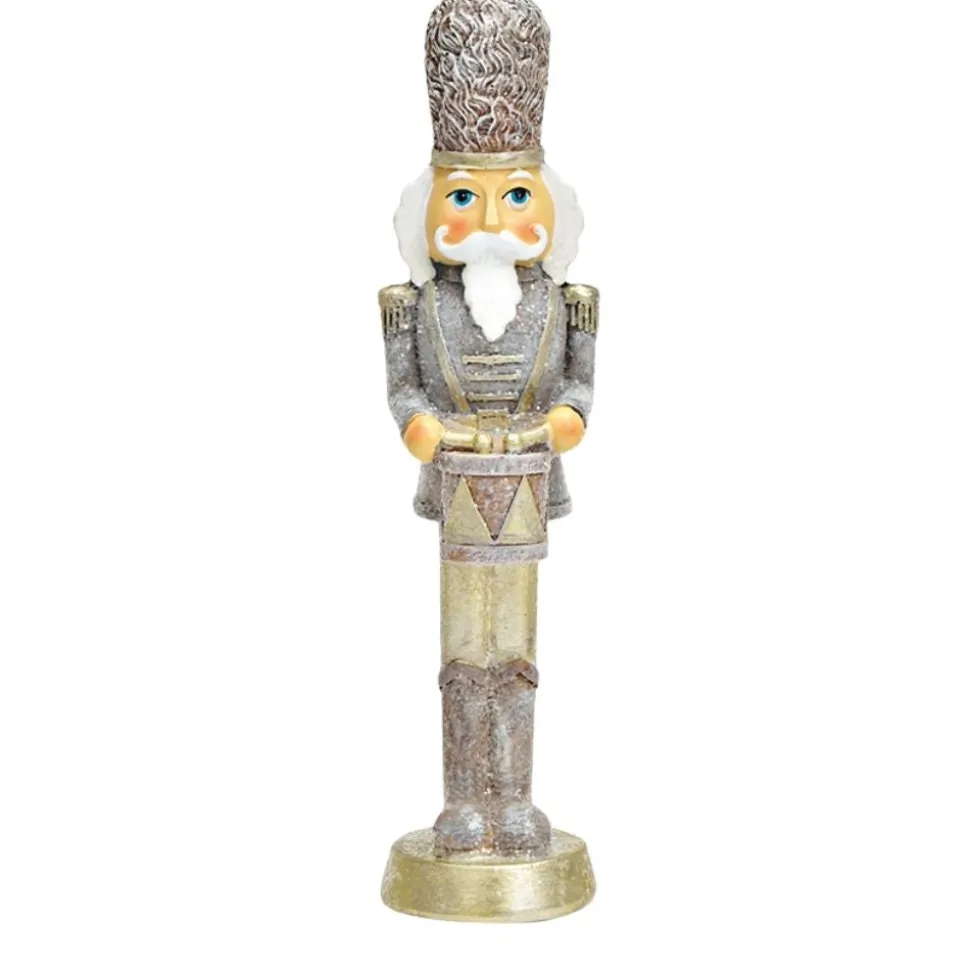 Dieser stilvolle Nussknacker Hannes in kühlen Grau-, Gold- und Silbertönen bringt winterlichen Charme und festliche Eleganz in deine Weihnachtsdekoration. In den Händen hält er eine kleine Trommel, als würde er gerade zum Rhythmus eines festlichen Marsches durch den Schneesturm schreiten. Sein goldfarbener Sockel verleiht ihm Standfestigkeit und einen edlen Akzent, der perfekt mit den silberfarbenen Details harmoniert.