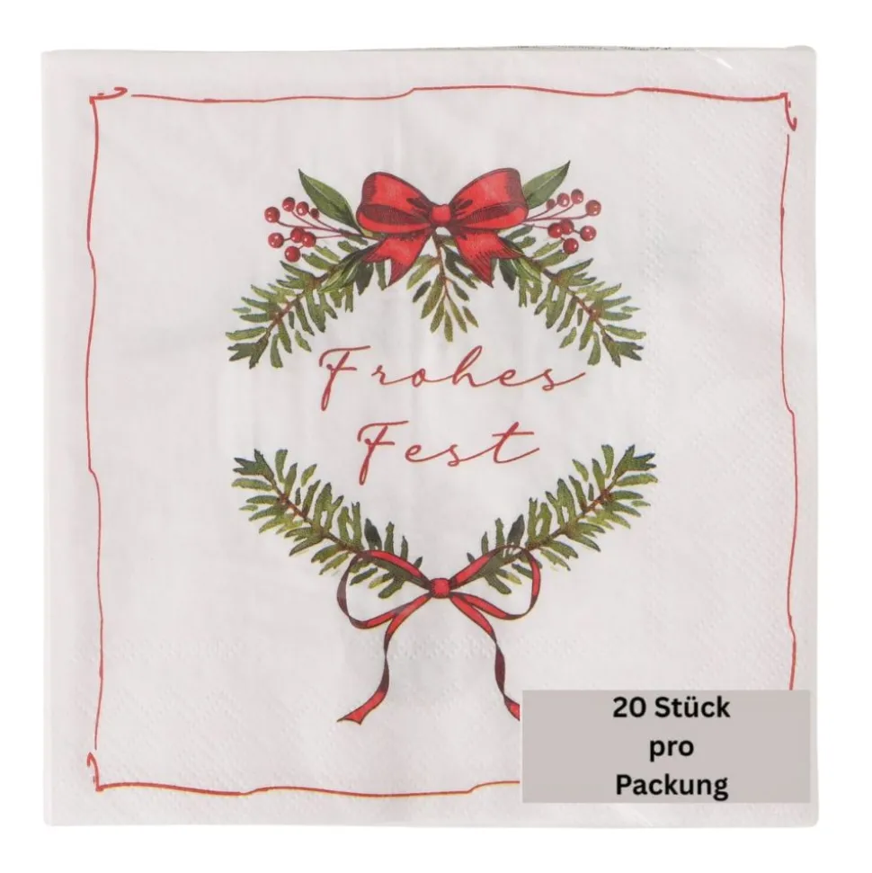 Mit diesem 20er-Set Papierservietten Frohes Fest bringst Du festlichen Glanz und warme Stimmung auf Deinen Weihnachtstisch. Der liebevoll gestaltete Weihnachtskranz umrahmt den herzlichen Schriftzug und verleiht jeder Mahlzeit eine gemütliche, heimelige Atmosphäre, die zum gemeinsamen Genießen und Verweilen einlädt. Ob beim Weihnachtsessen mit der Familie, Adventskaffee oder der festlichen Feier – diese Servietten sind praktische Helfer und zugleich ein stimmungsvolles Detail, das Deine Dekoration perfekt ergänzt. Mit ihnen wird jeder Tisch liebevoll eingedeckt und jeder Moment fühlt sich besonders an. So wird das Frohe Fest zu einem echten Erlebnis voller Wärme, Freude und unvergesslicher Augenblicke.