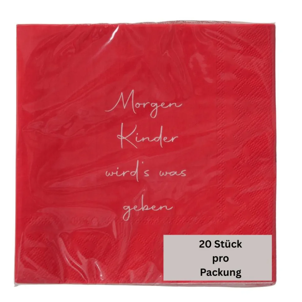 Mit dieser festlichen Papierserviette bringst du Weihnachtsstimmung direkt auf deinen Tisch. Die kräftige rote Farbe sorgt für ein warmes, einladendes Ambiente und erinnert an festliche Dekoration, liebevoll verpackte Geschenke und gemütliche Abende im Kerzenschein. Die weiße Aufschrift Morgen Kinder wirds was geben weckt Kindheitserinnerungen und verleiht deiner Tischdekoration einen nostalgischen, charmanten Touch.