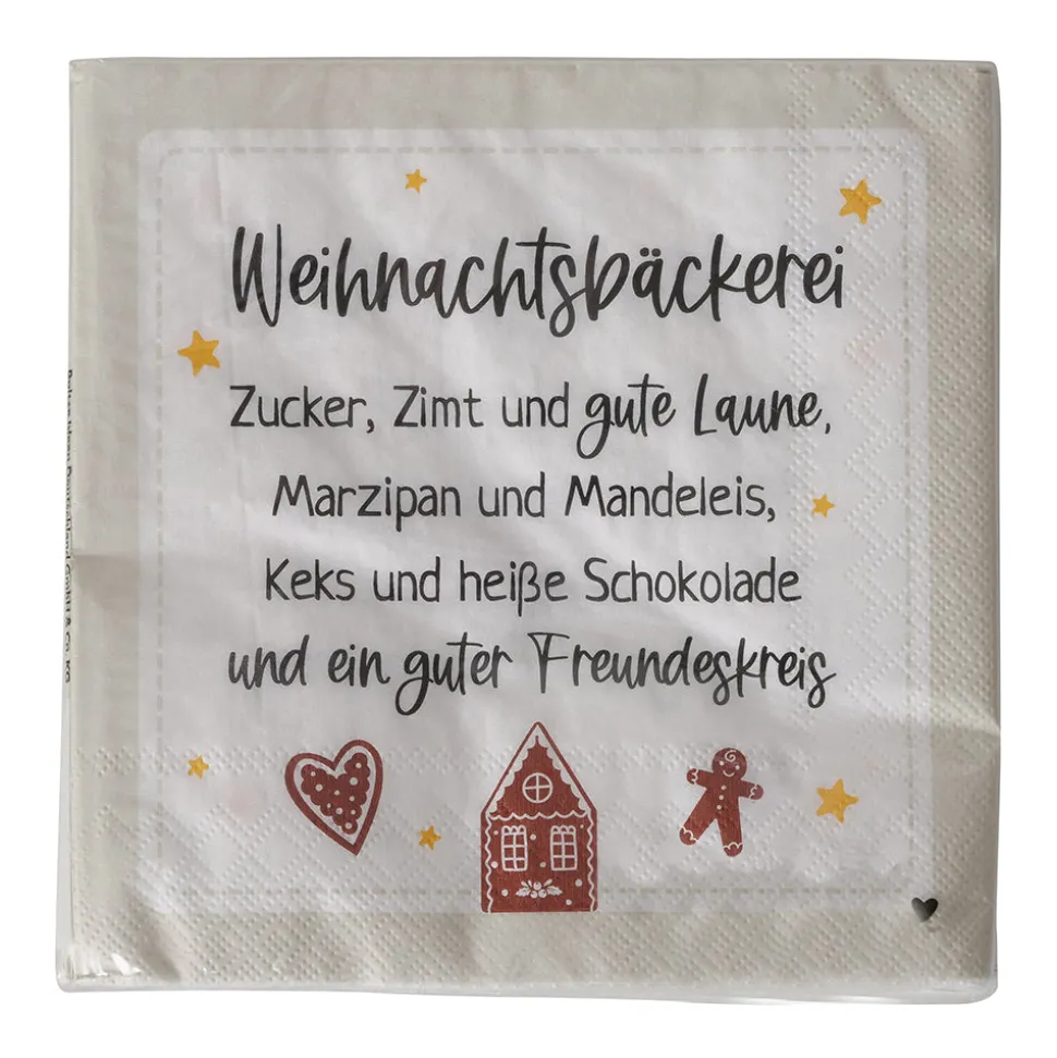 Was gehört für Dich in eine Weihnachtsbäckerei? Zucker, Zimt und gute Laune, Marzipan und Mandeleis, Keks und heiße Schokolade und ein guter Freundeskreis auf jeden Fall! Diese Papierservietten kommen im 20er-Pack zu Dir nach Hause und werten Deine festliche Tafel gekonnt auf. Entdecke weitere tolle Weihnachtsartikel hier in unserem Onlineshop.