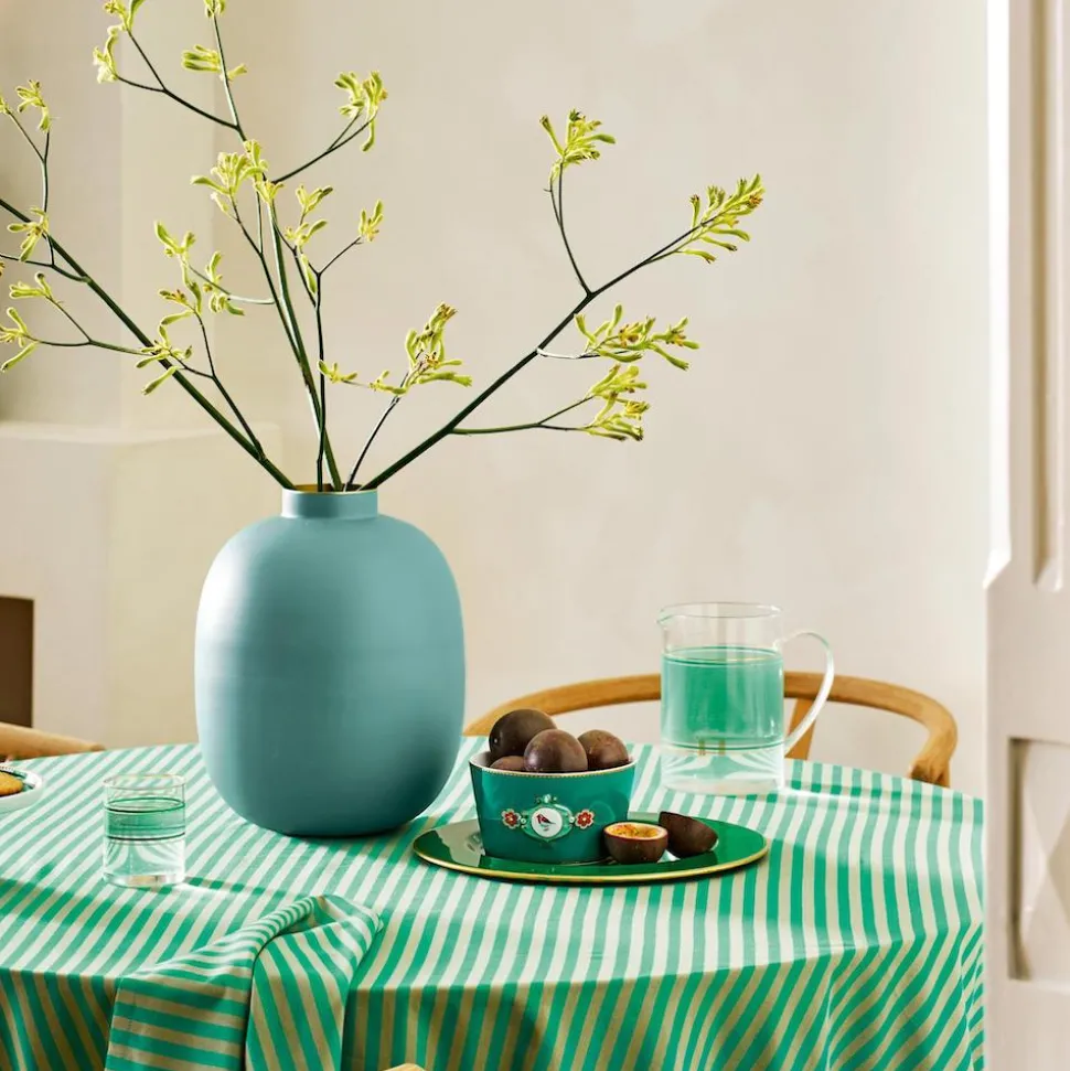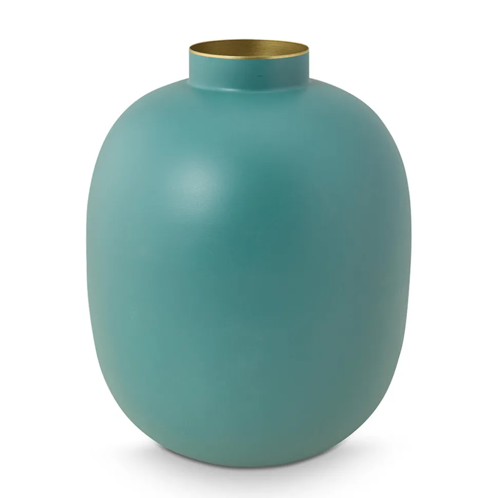 Ein toller Blickfang ist diese matte Metallvase aus den Hause Pip Studio. Der blaugrüne Farbton passt wundervoll zu verschiedenen Geschirrkollektionen von Pip Studio. Entdecke die unterschiedlichen Gestaltungsmöglichkeiten der bauchigen Vase und lasse Deiner Fantasie freien Lauf. Die Vase hat einen Durchmesser von 25 cm und eine Höhe von 32 cm.