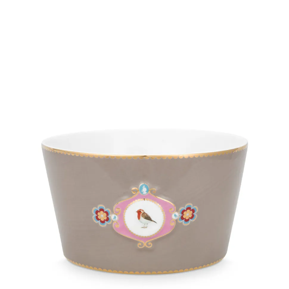 Schluss mit langweilig weißem Geschirr! Die Schale Love Birds Medallion von Pip Studio wird euch mit ihrem trendigen Khaki sicher begeistern. Die Schüssel ist mit ihrem erhabenen Medaillon, das von einem Rotkehlchen geziert wird, wirklich etwas ganz Besonderes! Die Bordüre aus Blumen und die edlen Goldornamenten sind einfach traumhaft. Diese Schale hat wirklich das Zeug zu deiner neuen Lieblingsschüssel! Bei uns im Shop findet ihr noch mehr fantasievolle Kollektionen von Pip Studio, die sich wundervoll miteinander kombinieren lassen.