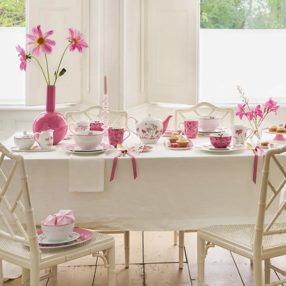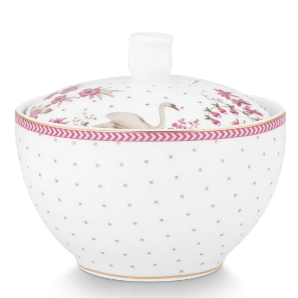 Diese Zuckerdose wird Dich mit ihrem gepunkteten Muster sofort begeistern. Rosafarbene Blumen runden das Aussehen des Döschens romantisch ab. Ein mysteriöser Schwan, fast erzählt es Dir mit seinem liebevoll gestalteten Dekor am Tisch eine Geschichte. Lasse auch Du Dich inspirieren.