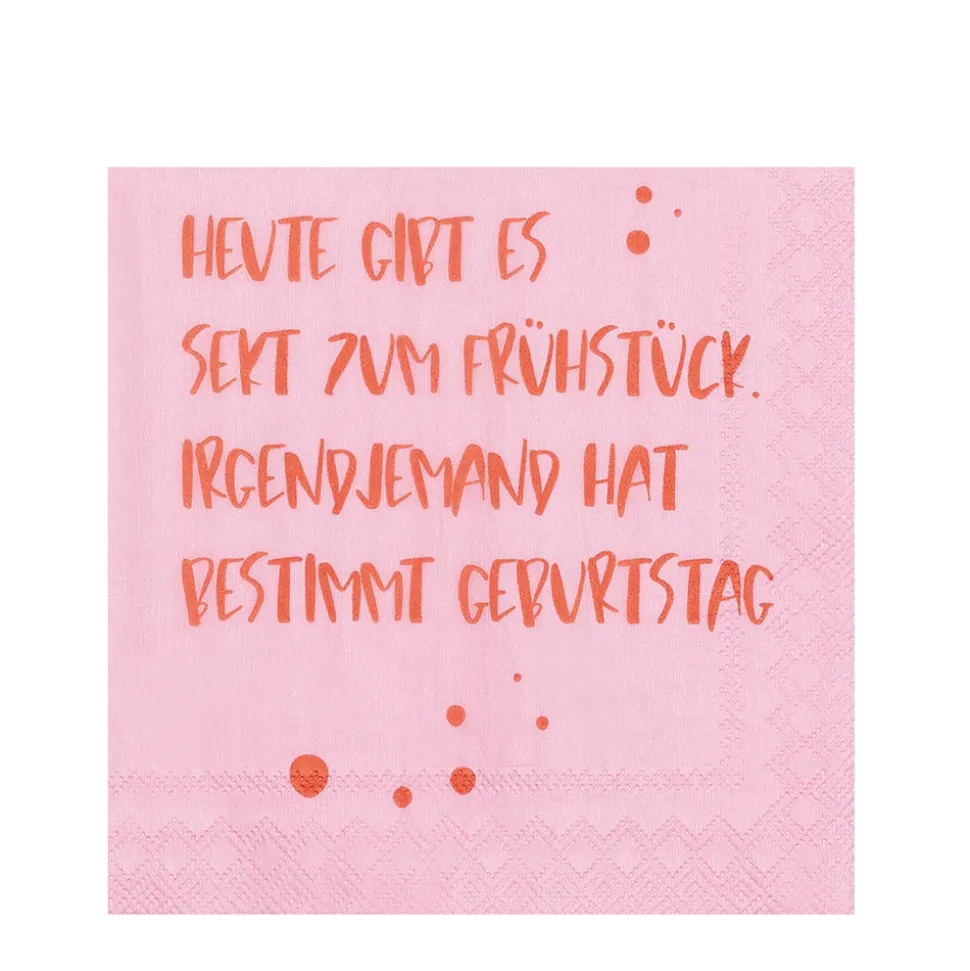 Heute gibt es Sekt zum Frühstück. Irgendjemand hat bestimmt Geburtstag. Starte Deinen Tag mit einem Lächeln und diesen humorvollen Cocktailservietten von Räder. Die Papierservietten machen jedes Frühstück zu einem besonderen Erlebnis und sorgen für viele Lacher und gute Laune. Durch ihre kompakte Größe von 25 x 25 cm sind sie ideal für Buffets, Empfänge oder als dekoratives Element auf dem Tisch. Unterstreiche mit diesen Cocktailservietten die herzliche Stimmung des gemeinsamen Moments. Du erhältst 20 Servietten pro Packung zu Dir nach Hause.