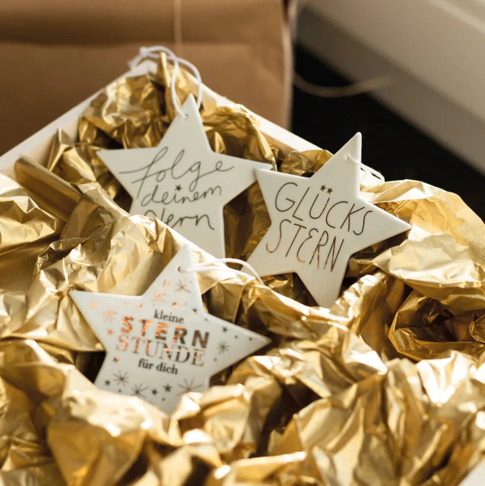 Eine kleine Sternstunde gibt es jetzt nur für dich und das in Form des Räder Glücksstern Hängers. Aber nicht nur für eigenen Sternstunden eignet sich der dekorative Stern prima, sondern auch als Geschenk, um einem geliebten Menschen eine besondere Freude zu machen. Der Stern von Räder hat einen Durchmesser von ca. 8,2 cm und besteht aus Porzellan, mit glänzenden, goldfarbenen Verzierungen.