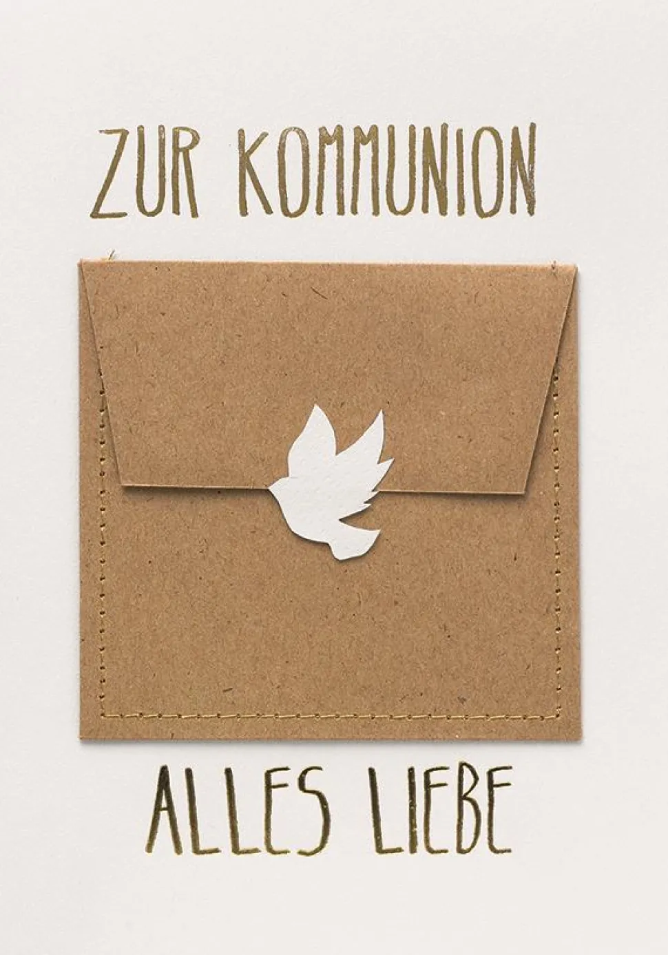 Die Gutschein Karte Zur Kommunion von Räder ist eine ganz besondere Karte. Sie besteht aus weißem Karton und hat eine Größe von 12 x 17 cm. Auf der Vorderseite findest Du einen kleinen Umschlag aus braunem Natronpapier. Der Umschlag wird von einem kleinen weißen Vogel verschlossen, der als Sticker auf dem Umschlag klebt. Über und unter dem Umschlag findest Du auf der Karte in goldfarbener Heißsiegelung die Worte: Zur Kommunion alles Liebe. Im Inneren der Karte ist dann genügend Platz für liebe Worte und Wünsche, die Du zu diesem besonderen Anlass gerne mitgeben möchtest.