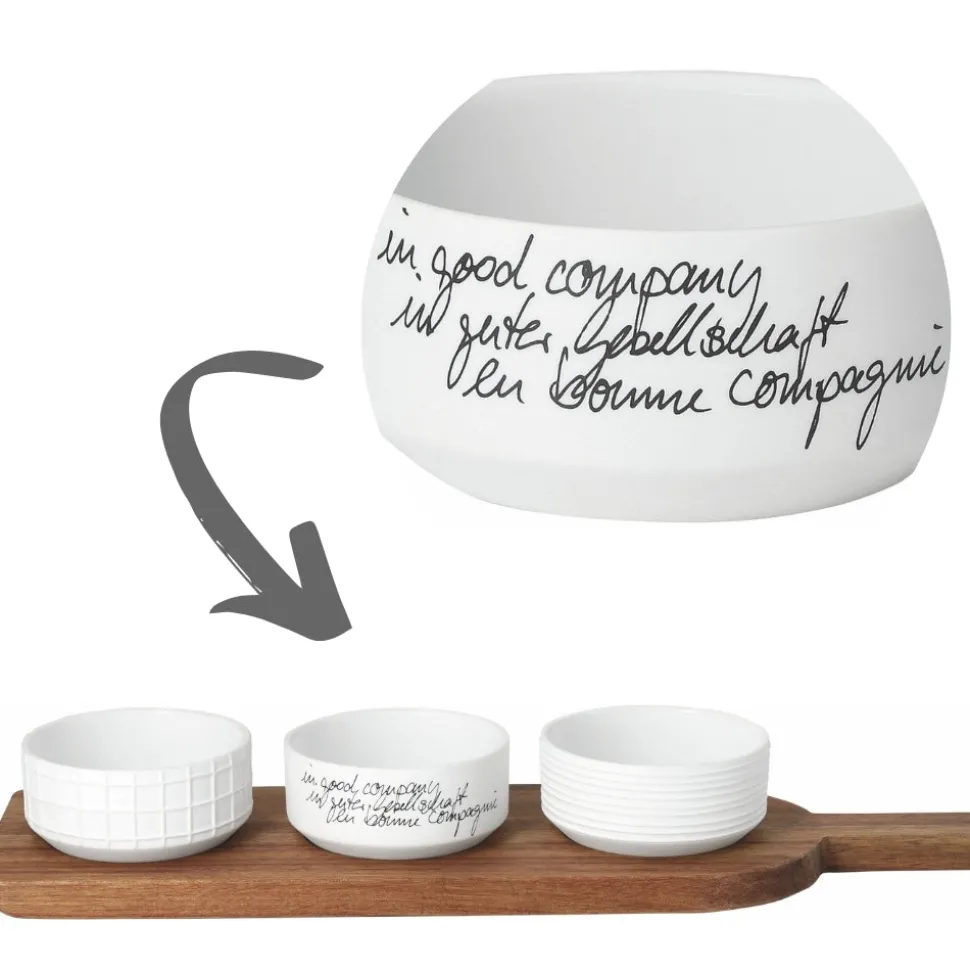 Genieße das Leben in guter Gesellschaft – vielleicht bei einem Glas Wein, etwas Käse, knusprigem Brot, aromatischen Dips. Das Häppchenweise Servierbrett von Räder hilft Dir, Deine Leckereien gut und sicher zu präsentieren. In die drei weißen Porzellanschälchen passen kleine Amuse-Gueules genauso gut wie Pralinen und Nüsse.