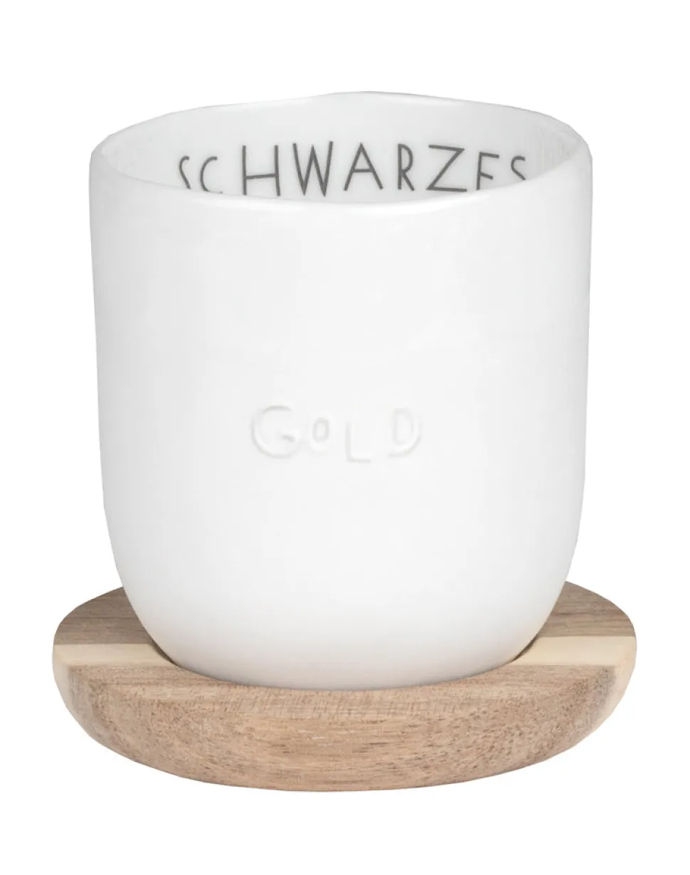 Der Kleine Becher Schwarzes Gold von Räder ist etwas ganz Besonderes. Dieser Kaffeebecher besteht aus weißem Porzellan und steht auf einem kleinen Teller aus Akazienholz. Der Teller hat eine Stärke von 1,5 cm und einen Durchmesser von 6,5 cm. Der Becher ist 6 cm hoch, hat einen Durchmesser von 5,5 cm und bietet Platz für ca. 75 ml pures schwarzes Gold – oder eben Kaffee.Im Becher steht in schwarzer Schrift das Wort: Schwarzes. Auf dem Becher findest Du ein Relief mit dem Wort: Gold. Und auf dem Boden des Bechers befindet sich ein kleines Highlight: Eine Prägung in Form eines Sterns. Mit diesem Kaffeebecher wird es wirklich nicht langweilig am Frühstückstisch.