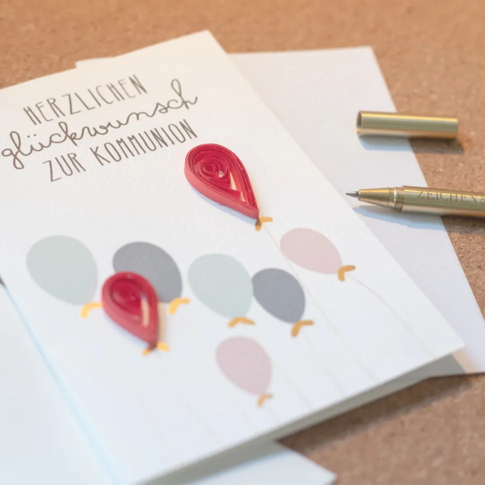 Die Kreiskarte Herzlichen Glückwunsch zur Kommunion ist eine Klappkarte aus weißem Papier. Sie ist 12 x 16,5 cm groß und bietet damit im Inneren ausreichend Platz für liebe Worte und Glückwünsche zum besonderen Tag. Auf der Karte findest Du viele kleine gemalte Luftballons, die mit einer gelben Schleife verziert an einer Schnur hängen. Zwei dieser Ballons sind aber besonders. Denn sie bestehen aus aufgerolltem roten Papier, wodurch ein toller 3-D-Effekt entsteht. Über den Luftballons stehen in schwarzer Schrift die Worte: Herzlichen Glückwunsch zur Kommunion. Und damit erfüllt die Karte alle Vorstellungen, die man durch ihren Namen hatte oder?