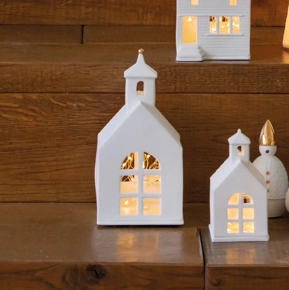 Nicht nur in klein gibt es sie von Räder, sondern auch als Lichthaus Kapelle groß! Mit goldfarbener Spitze unterstreicht Räder nochmal, wie imposant so eine große Kapelle sein kann, besonders bei einer Höhe von 22,5 cm. Hebst Du die 12,5 x 11 cm Kapelle an, findest Du Platz für ein Teelicht auf der Platte aus Porzellan.