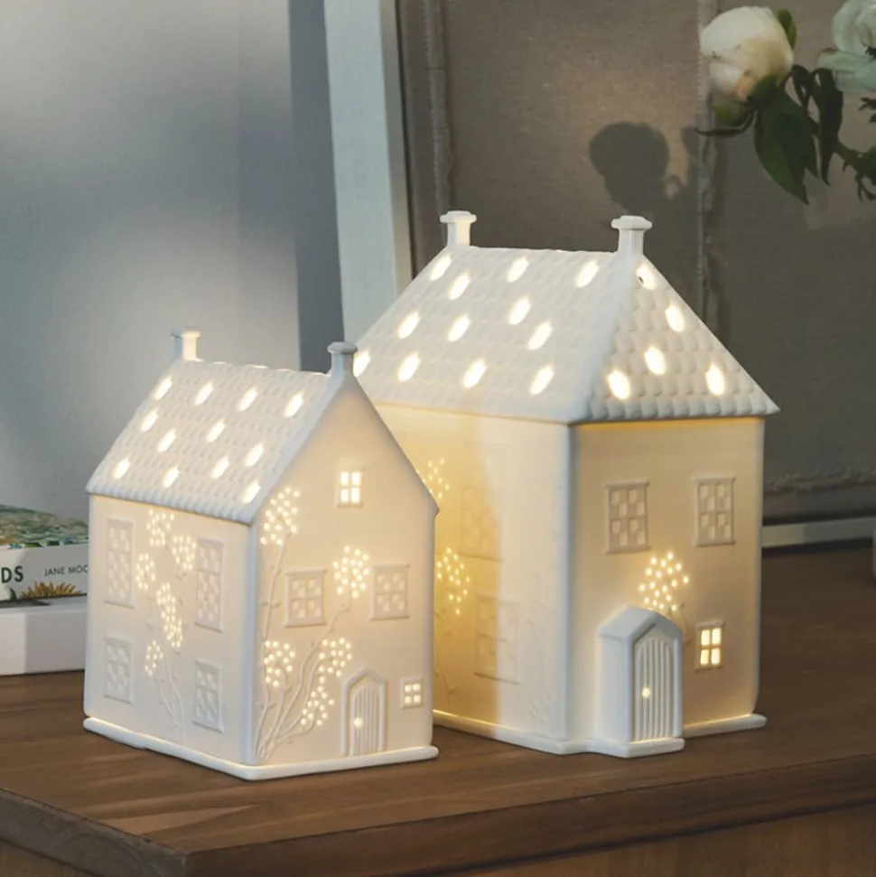 Ein geheimer Garten, ein verborgenes Haus – wer mag dort wohl zu Hause sein? Das Licht brennt bereits. Du kannst es an dem Flackern in den Fenstern erkennen. Ein wenig magisch, ein wenig verträumt steht es da, das kleine Lichthaus Cottage von Räder. Pflanzenranken, zwischen denen das Licht hindurchschimmert, umgeben die Hauswände. Vielleicht wohnt eine verwunschene Prinzessin im Cottage, vielleicht ist ein Prinz bereits dabei, die Pflanzenranken zu durchbrechen? Mit diesem Lichthaus aus feinem Porzellan holst Du Dir ein Stück Märchenzauber in Dein Heim. Ob auf dem Fensterbrett, dem Sideboard oder als stimmungsvoller Blickfang im Eingangsbereich – das Lichthaus taucht Deine Räume in ein warmes, einladendes Licht. Sein verspieltes Design verbindet rustikalen Charme mit zeitloser Eleganz und passt perfekt zu einem gemütlichen Cottage-Stil und einem natürlichen Landhaus-Ambiente.Das Lichthaus ist ideal, um kleine Teelichter sicher auf der Bodenplatte zu platzieren und zu inszenieren. So kannst Du ganz einfach für entspannte Momente sorgen – alleine oder mit lieben Menschen. Die zarten Ranken verleihen dem Haus ein lebendiges Spiel aus Licht und Schatten, das zum Träumen einlädt.Kombiniere das Cottage-Lichthaus mit weiteren Lichthäusern aus der Räder Kollektion und schaffe Dir eine kleine Fantasiewelt voller Charme und Wärme.Entdecke die Geschichten von Räder, werde Teil von Ihnen und vergiss den Alltag für einen wertvollen Augenblick.