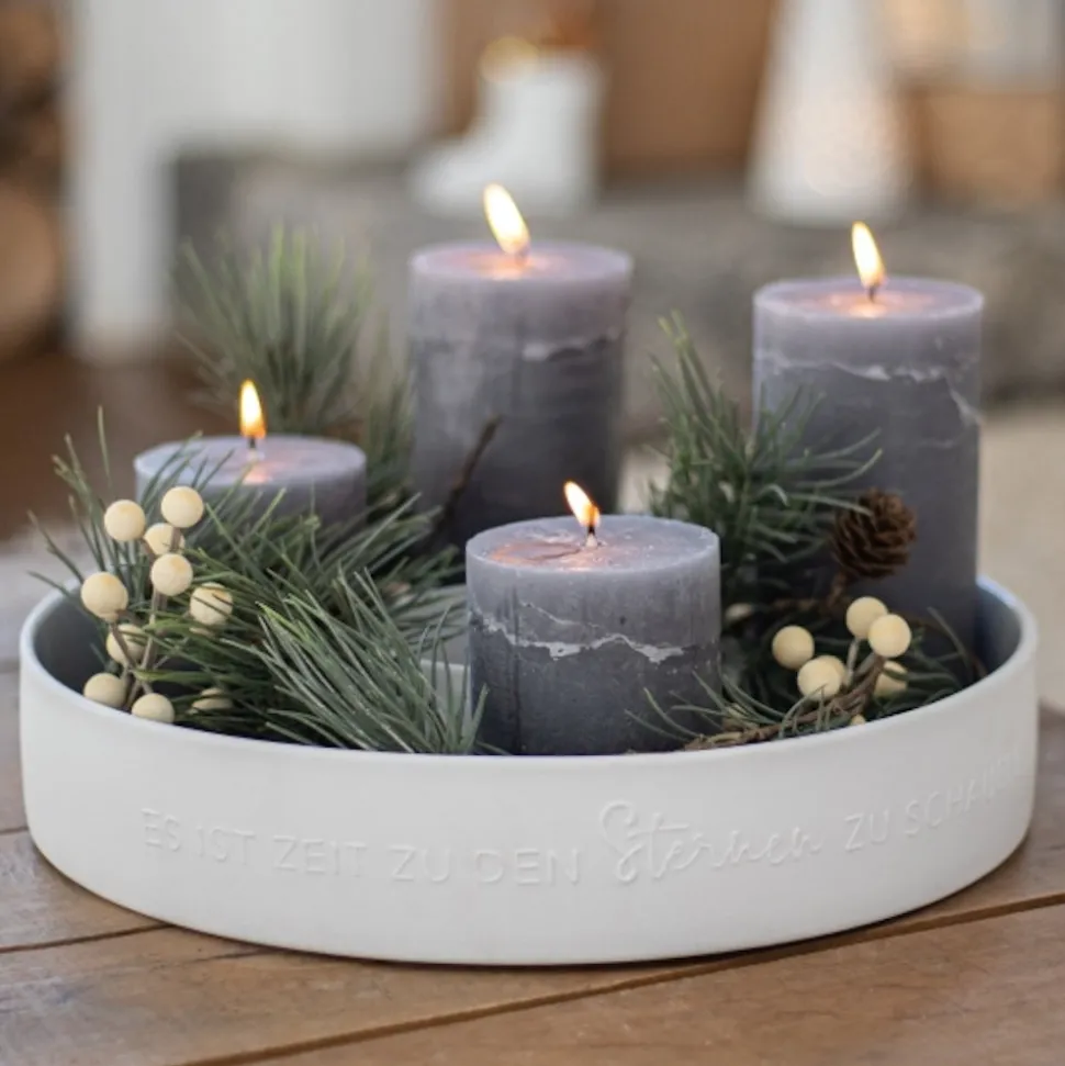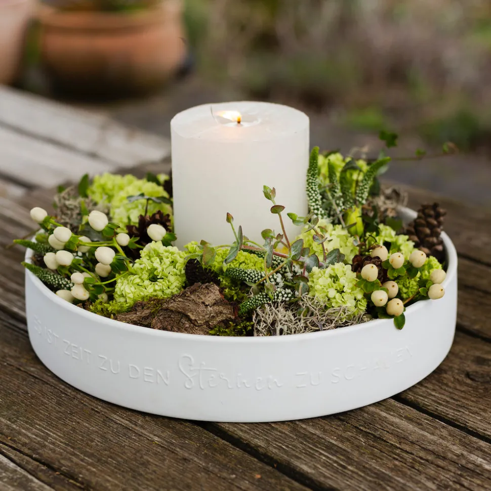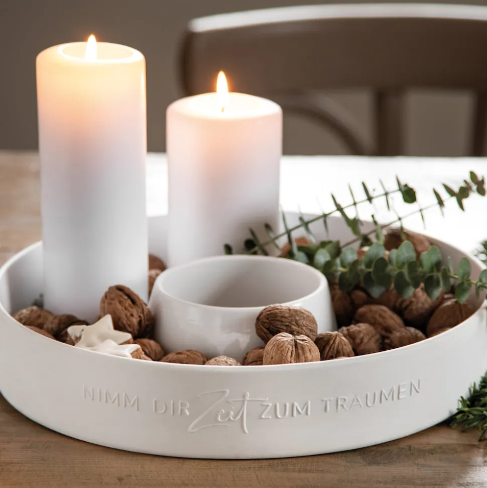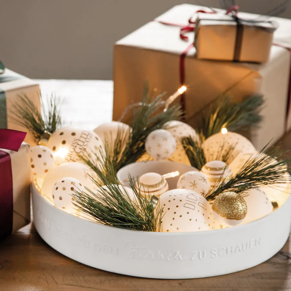 Wann hast du das letzte Mal deine Gedanken einfach schweifen lassen – ohne Zeitdruck, ohne Verpflichtungen? Der Porzellankranz von Räder erinnert dich auf liebevolle Weise daran, dir genau diese Momente der Ruhe und des Träumens zu gönnen.Der schlichte, elegante Kranz aus feinem Porzellan trägt zwei einfühlsame Botschaften:„Nimm dir Zeit zu träumen“ auf der einen und „Es ist Zeit, zu den Sternen zu schauen“ auf der anderen Seite.Zwei Sätze, die dich dazu einladen, im Alltag innezuhalten und auf deine innere Stimme zu hören.Mit seinen Maßen von 6 x 32 cm ist der Kranz nicht nur ein dekoratives Highlight, sondern bietet auch Raum für persönliche Gestaltungsideen. Ob mit einer Lichterkette, Naturmaterialien, Trockenblumen oder kleinen Erinnerungsstücken – deiner Kreativität sind keine Grenzen gesetzt. So wird der Kranz zu einem ganz individuellen Begleiter durch das Jahr.Als Tischdekoration, auf dem Sideboard oder als Geschenk für einen lieben Menschen: Der Räder Porzellankranz bringt Leichtigkeit, Achtsamkeit und eine besondere Stimmung in dein Zuhause.Er ist nicht nur ein dekoratives Element, sondern auch ein stiller Impulsgeber – für mehr Träume, mehr Zeit für dich und mehr Blick in Richtung Sterne.