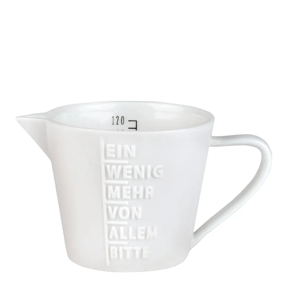 Es fehlt noch ein kleines bisschen! Gerade beim Backen oder Kochen wird der Räder Messbecher Ein wenig mehr, sehr praktisch sein und auch für ein Schmunzeln sorgen. Denn der Spruch auf der Vorderseite ist etwas, was wir alle am liebsten sagen würden, wenn noch etwas fehlt. Der schöne Messerbecher von Räder besteht aus weißem Porzellan und misst ca. 7 cm in der Länge und Breite, so wie 11 cm in seiner Höhe.
