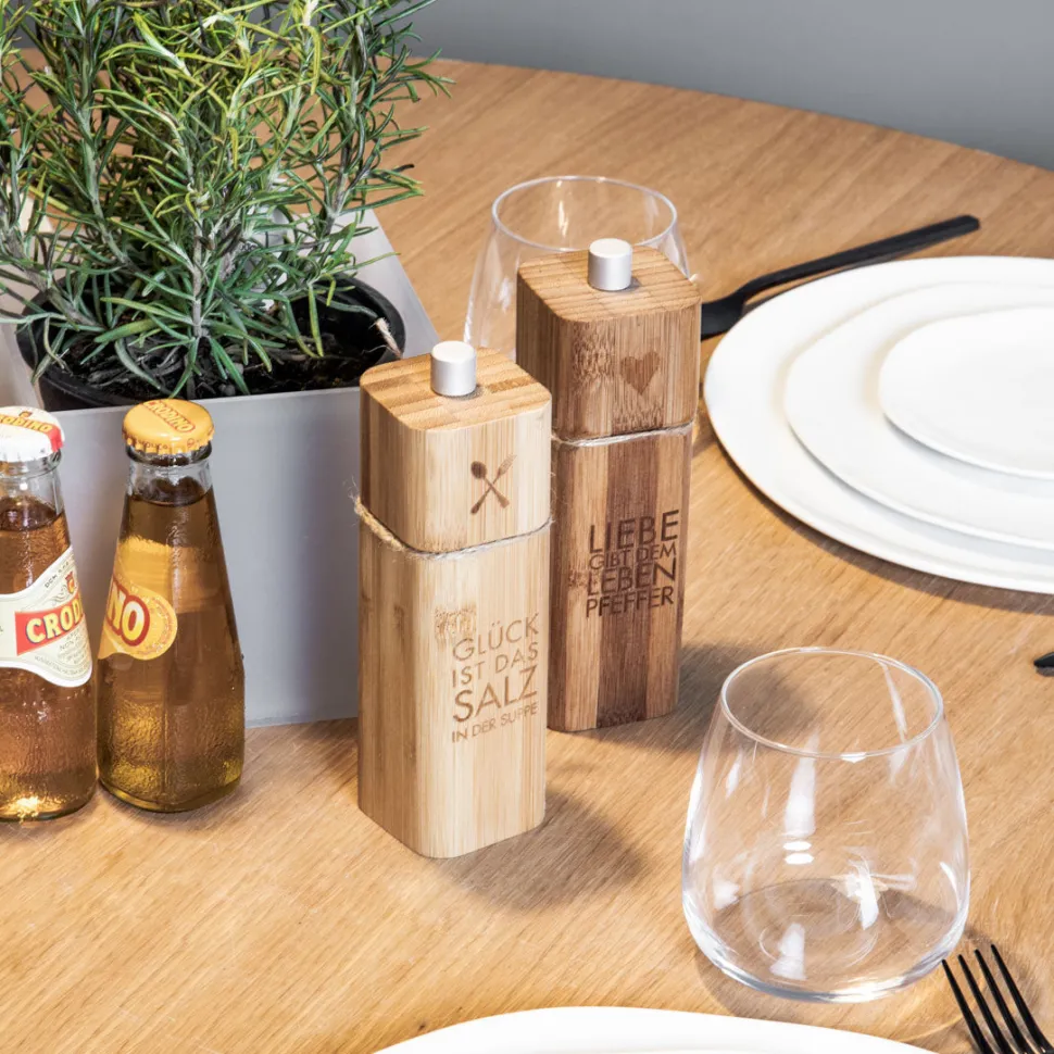 Mit einer Größe von 5 x 5 cm und einer Höhe von 16 cm passt diese Pfeffermühle perfekt auf Deinen Esstisch, in Deine Küche und sogar auf den Nachtschrank, falls mal ganz gemütlich im Bett genascht wird. Und was auf die Pfeffermühle „Liebe“ von Räder auch zutrifft: Es sind die inneren Werte, die zählen! Denn im Inneren der Mühle befindet sich ein Mahlwerk aus Keramik, dass Dir Dein Essen zuverlässig und gut portioniert nachwürzen wird. Wobei man natürlich die hübsche Hülle nicht vergessen darf, die aus nachhaltigem Bambusholz gefertigt ist. Darauf wurde der Spruch gelasert, der die Pfeffermühle zu einem echten Hingucker macht.