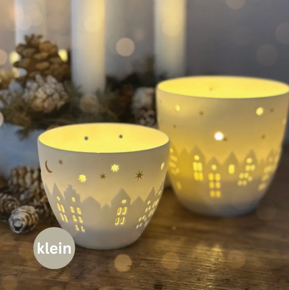 Das Räder Poesielicht Häuser in Mini bietet Dir einen traumhaft schönen Anblick, wenn Du ein Teelicht in die Mitte des Poesielichts stellst. Die Sonne versinkt langsam, die Sterne werden immer klarer und in den Fenstern der vielen Häuser beginnt ein Licht nach dem anderen zu leuchten. Das schöne Poesielicht in Mini von Räder ist 6,5 x 8 cm groß und besteht aus Porzellan.