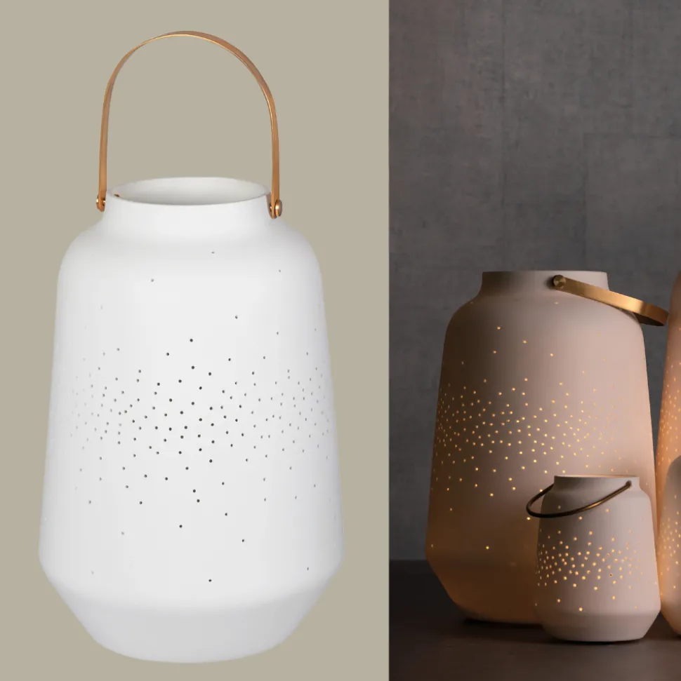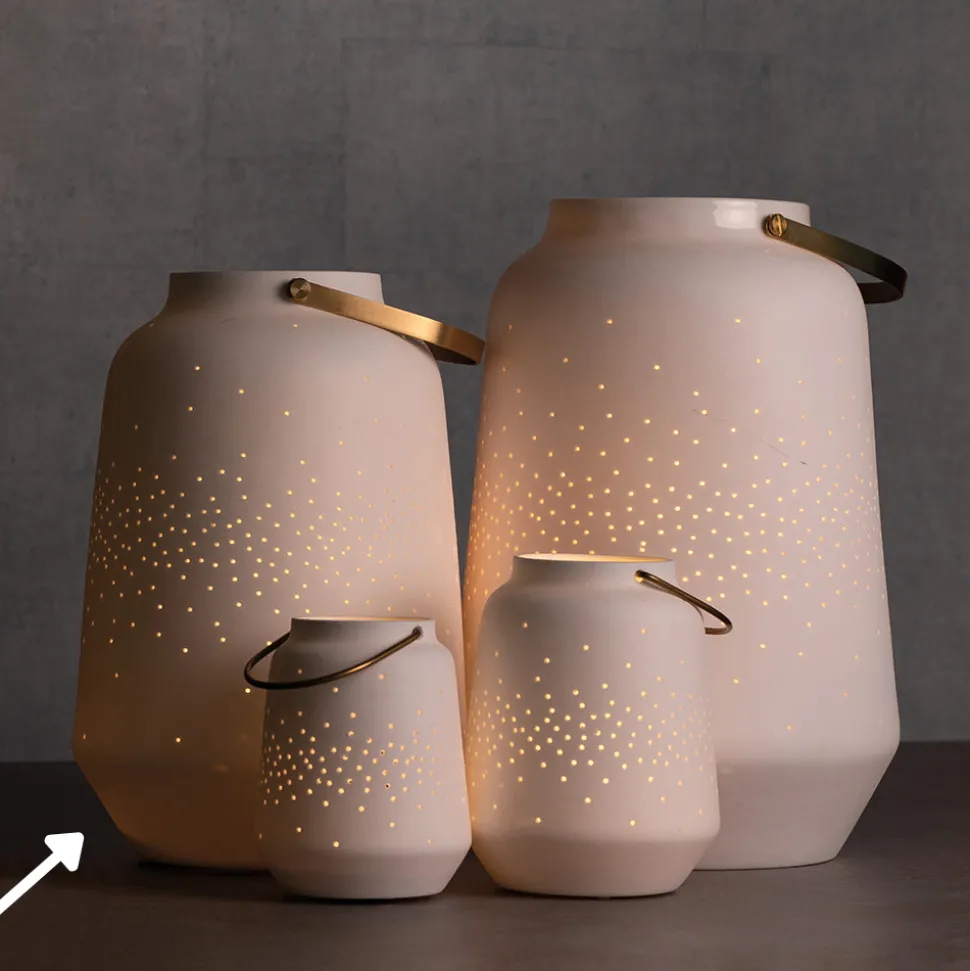 Für ganz viel romantische und gemütliche Stimmung am Abend sorgt bei Dir Zuhause die kleine Räder Porzellanlaterne. Das schöne Licht, das durch die vielen verstreuten Löcher fällt, erinnert uns an ein ganzes Meer aus Sternen an einem klaren Nachthimmel. Ein Anblick der zum Träumen einlädt. Die 26,5 x 17,5 cm Laterne von Räder besteht aus weißem Porzellan und der praktische Griff zum Tragen aus Messing.