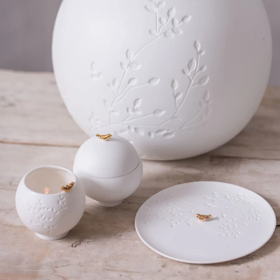 Der Porzellanteller Goldfarbener Vogel wurde in liebevoller Handarbeit gefertigt und misst insgesamt 14 cm im Durchmesser. Das weiße Porzellan, auf dem der goldfarbene Vogel sitzt, lässt diesen mitten auf dem Teller zu einen kleinen Hingucker werden. Lasse auch Du Dich von den Räder Produkten inspirieren.