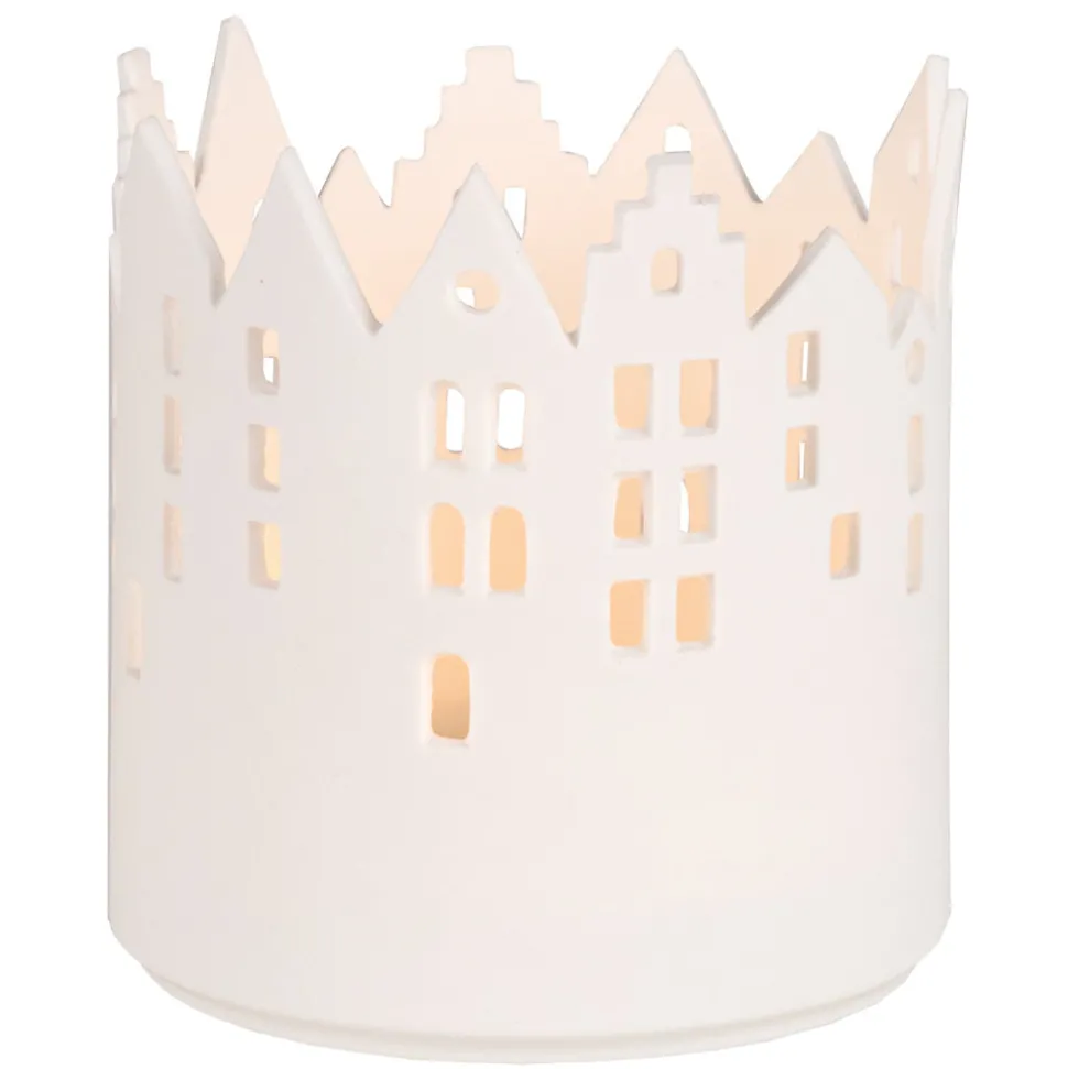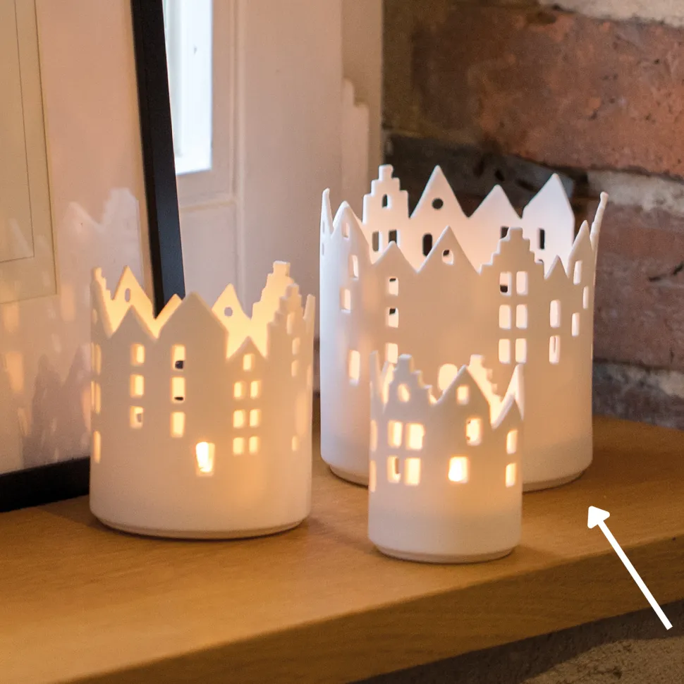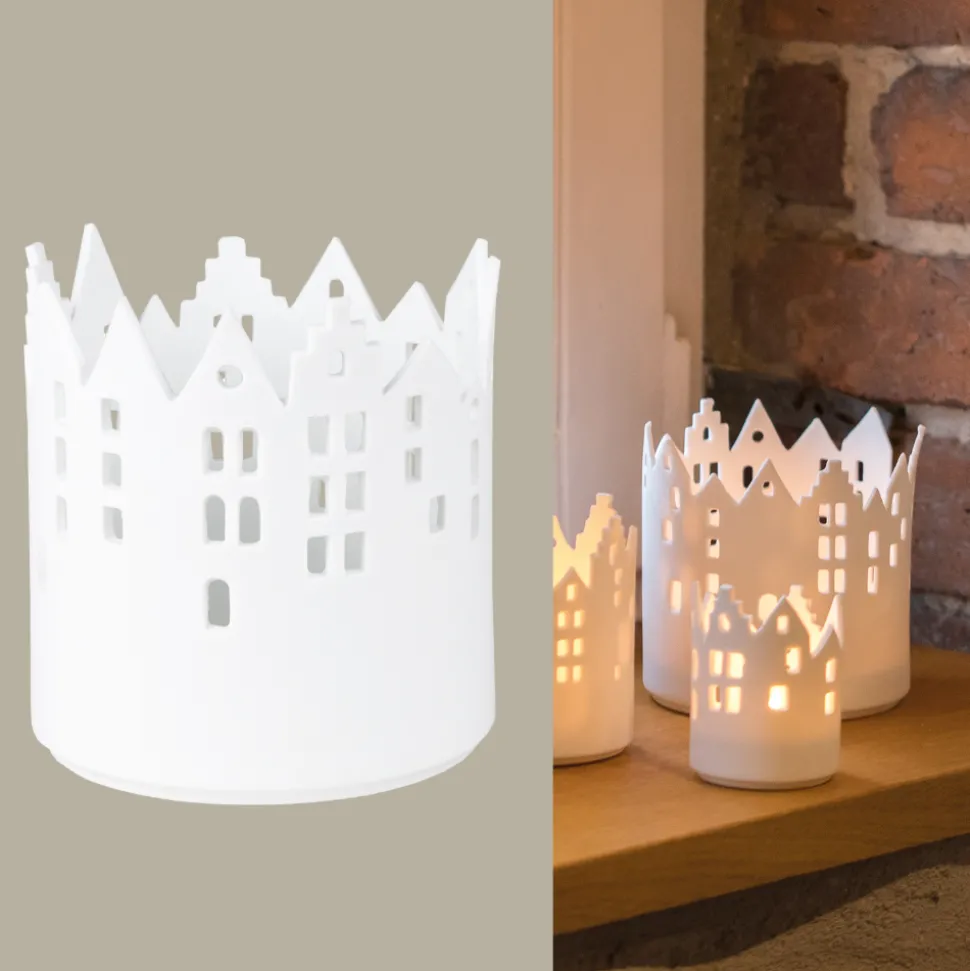 Das weiße Stadtlicht Marktplatz von Räder mit seinen zahlreichen Fenstern ist aus feinstem Porzellan handgefertigt. Mit einem Teelicht bestückt, verbreitet das Schmuckstück ein angenehmes Licht und lädt zum Träumen ein. Lasse auch Du Dich von unseren Räder-Produkten verzaubern.