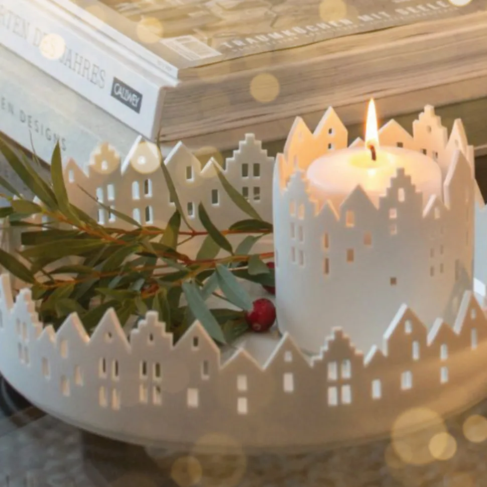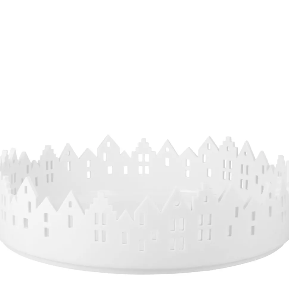 Die aktuelle Stadtschale überzeugt mit einem Durchmesser von stolzen 27,5 cm. Sie erzeugt das Ambiente eines runden Marktplatzes, der von zahlreichen Stadthäusern umgeben ist. Verschiedene Haus- und Dachformen sind zu entdecken, die Aussparungen in dem weißen Porzellan stellen die Fenster der Häuser dar.
