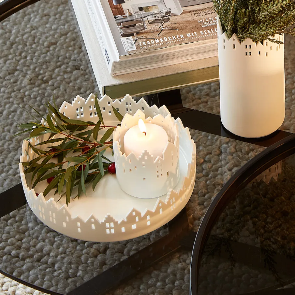 Durch ihre weiße Farbe und die von Lichtern beleuchtbaren Fenster kommt die Schale zwar besonders in dunklen Jahreszeiten zur Geltung, sie ist aber viel zu schön, um sie irgendwann wieder im Schrank verschwinden zu lassen. Stattdessen ist sie ein ganzjährig verwendbares Schmuckstück, an dem Du viele Jahre lang große Freude haben wirst.