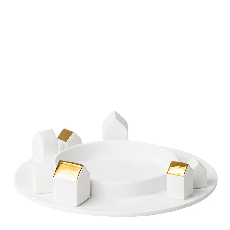 Das Windlicht Lichterdorf von Räder wird in Deinen vier Wänden für gemütliche Stimmung in der schönsten Zeit des Jahres sorgen. Vor allem das gefrostete Glas sorgt dafür, dass das Licht von Kerzen und LED-Leuchtmitteln auf geheimnisvolle Weise durchschimmert und die Häusersilhouetten toll in Szene setzt. Besonders die goldfarbenen Dächer der Porzellanhäuser, die das Licht widerspiegeln, runden das festliche Bild ab. Das Lichterdorf von Räder hat einen Durchmesser von 26,8 cm und eine Höhe von 23,5 cm.