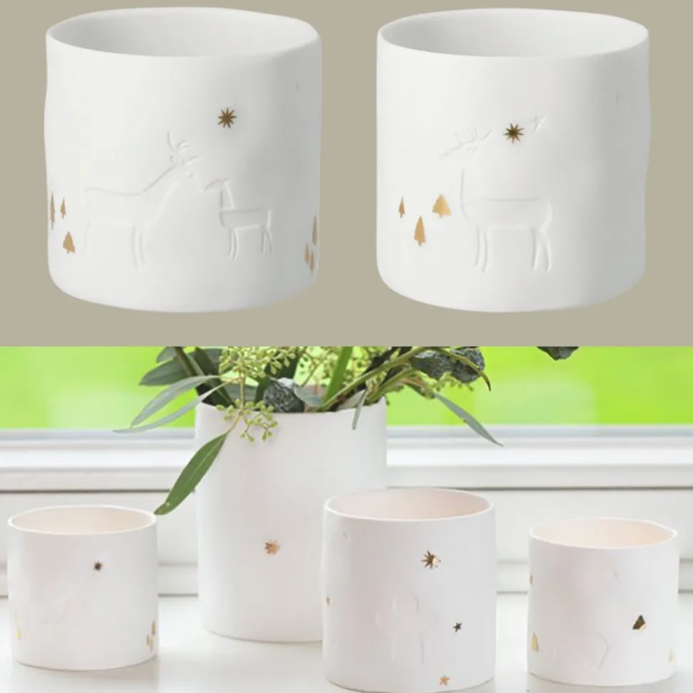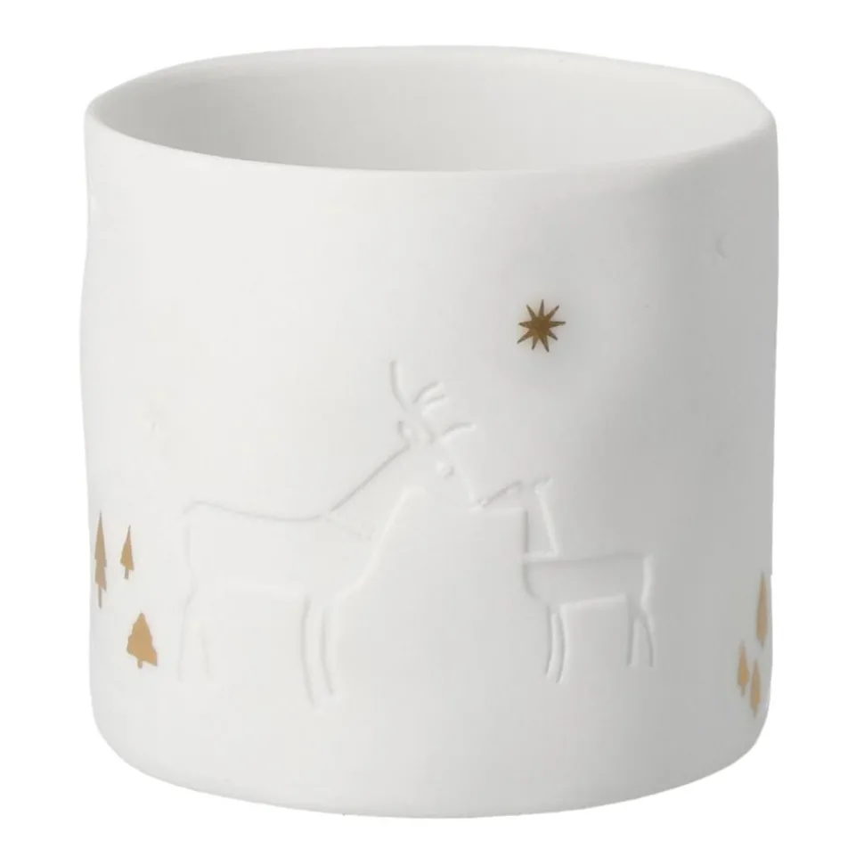 Stell ein Teelicht oder ein LED in dieses schöne Stück aus unglasiertem Porzellan und lasse das Licht aufleuchten. Der Stern wird jetzt erst recht wundervoll glänzen und den Eindruck erwecken, dass er die goldenen Tannen und den Schnee mit seinem Himmelslicht beleuchtet.