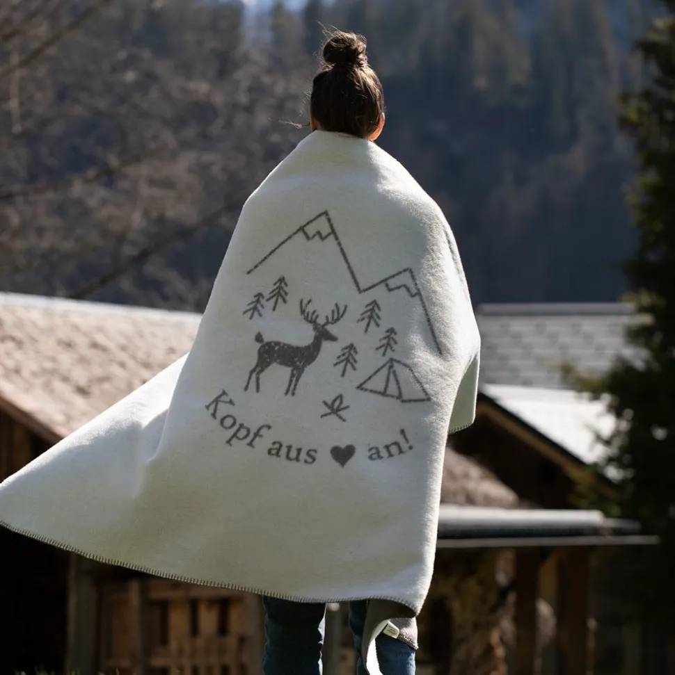 Diese Wohndecke mit den Maßen 150 mal 200 Zentimeter ist wie gemacht für alle, die sich nach Ruhe, Natur und einem Moment der Entschleunigung sehnen. Im Mittelpunkt des Designs steht ein liebevoll gestaltetes Motiv: Ein Zelt, davor ein Hirsch, der still am Lagerfeuer sitzt, und im Hintergrund erheben sich sanft gezeichnete Berge, alles gehalten in warmen Brauntönen, die eine beruhigende, erdige Atmosphäre schaffen. Darunter steht in klarer, schwarzer Schrift der Satz Kopf aus, Herz an, wobei das Wort Herz durch ein kleines, schwarzes Herzsymbol ersetzt ist. Eine Botschaft, die daran erinnert, den Alltag hinter sich zu lassen und dem Gefühl zu folgen, sei es auf Reisen, draußen in der Natur oder ganz einfach auf dem eigenen Sofa. Der Stoff ist weich, wärmend und liegt angenehm auf der Haut. Ob du dich nach einem langen Tag einkuschelst, einen Filmabend planst oder ein stilles Wochenende genießt, diese Decke sorgt für genau die richtige Portion Geborgenheit. Auch optisch ist sie ein echter Hingucker. Das stimmige Naturmotiv und die Botschaft laden zum Träumen ein und machen sie zu einem dekorativen Element auf Bett, Sofa oder in deiner Leseecke.