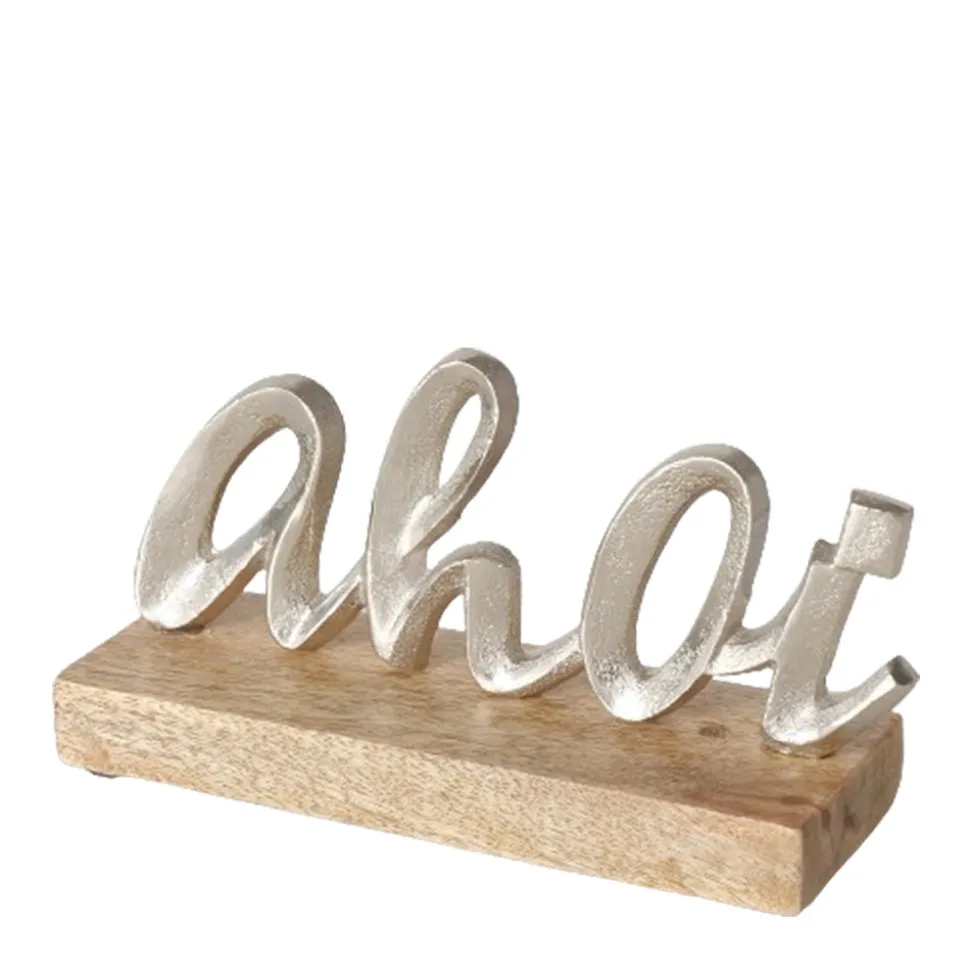 Der Ahoi Schriftzug auf seinem Holzfuß ist wie gemacht für alle, deren Herz beim Gedanken an das Meer, die Sonne und den Strand sofort höher schlägt. Lasse Dich im Eingangsbereich von dem silberfarbenen Ahoi Schriftzug begrüßen oder lasse ihn zum dekorativen Hingucker auf dem Sideboard oder der Kommode werden. Der Schriftzug Ahoi misst ca. 18 x 6 x 9,5 cm und besteht aus Aluminium, so wie Mangoholz.