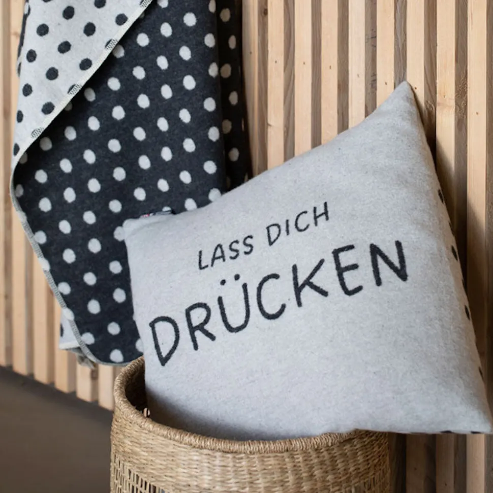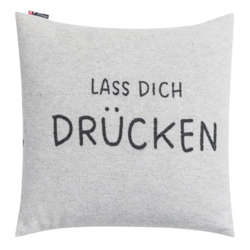Die Silvretta Kissenhülle von David Fussenegger sorgt mit ihrem Schriftzug Lass dich drücken für gute Laune und dank ihrer grauen Farbe für einen modernen Blickfang. Auf dem Sofa, dem Bett oder dem Lieblingssessel platziert, bringt die Kissenhülle eine gemütliche und einladende Atmosphäre mit sich.