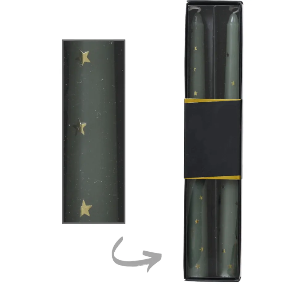 Erhelle Dein Zuhause mit unseren dunkelgrünen Stabkerzen, verziert mit einem goldfarbenen Sternenmuster. Mit einer Brenndauer von ca. 8 Stunden und einer Größe von 2 x 25 cm sind sie ideal für elegante Kerzenhalter auf dem festlich gedeckten Tisch. Ihre weihnachtliche Farbkombination und das sanfte Leuchten schaffen eine zauberhafte Atmosphäre in der schönsten Zeit des Jahres.