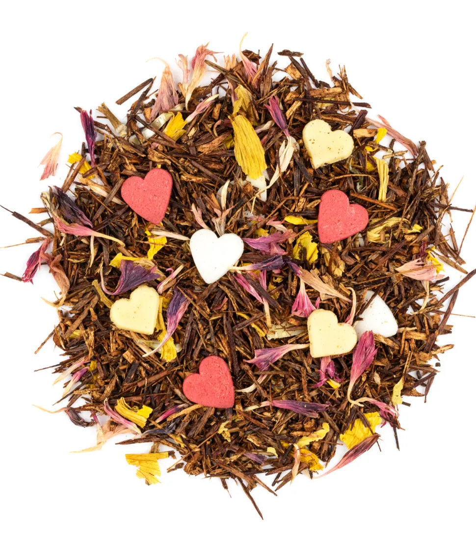 Zutaten: Rooibos, ROTE ZUCKERHERZEN (Zucker, Reismehl, gehärtetes ERDNUSSÖL, Kartoffelstärke, Farbstoff: E120, E160a, Aroma), WEISSE ZUCKERHERZEN (Zucker, Reismehl, ERDNUSSÖL teilweise gehärtet, Verdickungsmittel: Traganth, Aroma), WEISSE SCHOKOLADENHERZEN (Zucker, Kakaobutter, VOLLMILCHPULVER, Emulgator: Sonnenblumen-Lecithin), Aroma, Sonnenblumenblüten, rote Kornblumenblüten.