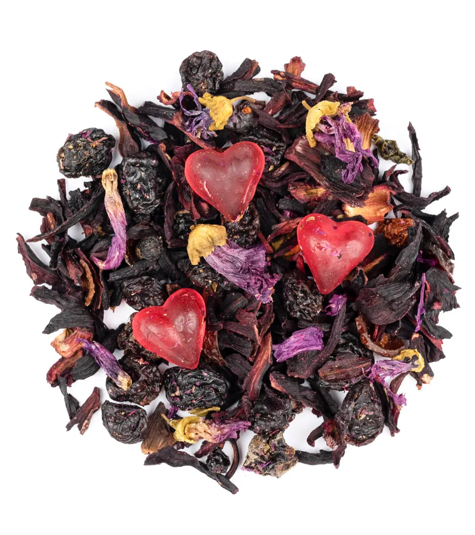 Zutaten: Beerenmischung (Korinthen, Hibiskus, Holunderbeeren), Fruchtgummiherzen (25%) (Glukosesirup, Zucker, 10% Fruchtsaft (Traube, Apfel, Birne, Pfirsich) aus Fruchtsaftkonzentraten, Gelatine, Säuerungsmittel: Zitronensäure, färbende Lebensmittel: Schwarze Johannisbeere, Karotte, Aromen, Palmkernöl, Überzugsmittel: Bienenwachs weiß und gelb, Carnaubawachs), Weinbeeren (Weinbeeren, Sonnenblumenöl), Hagebuttenschalen, Hibiskus, Aroma, Kiwistücke, Malvenblüten.